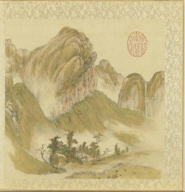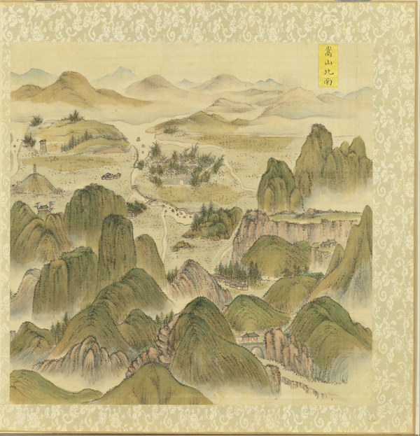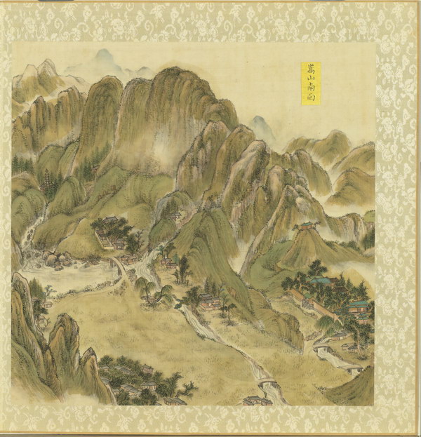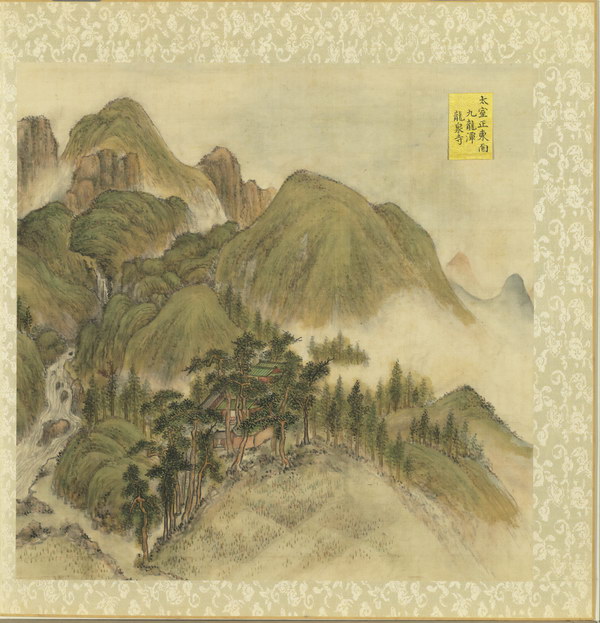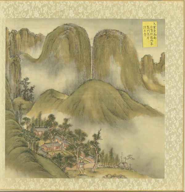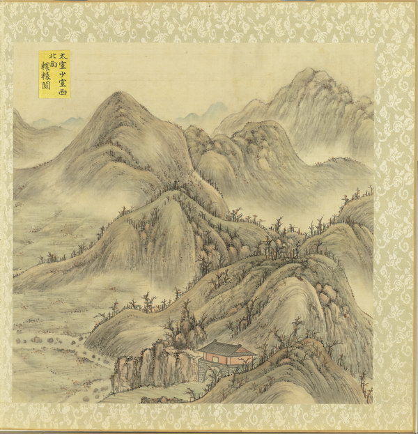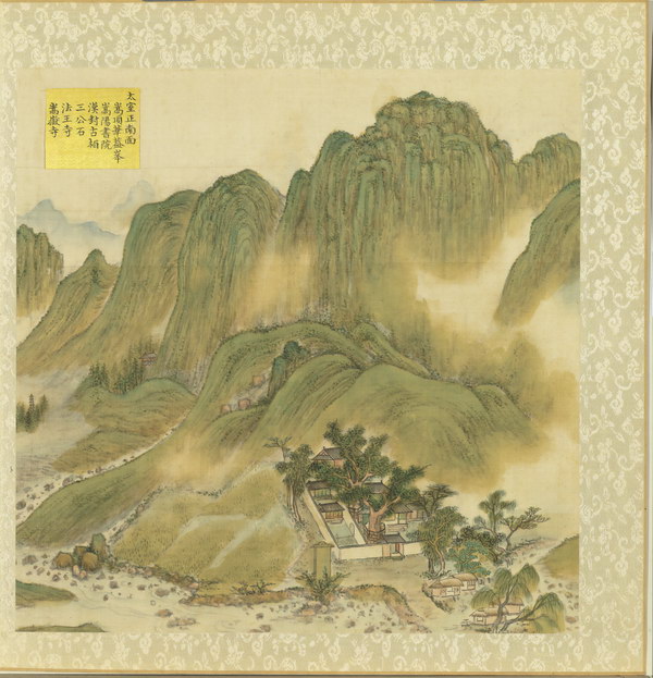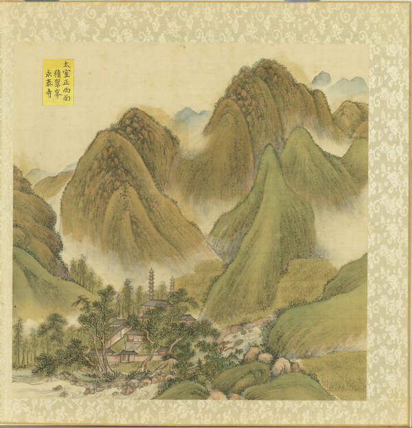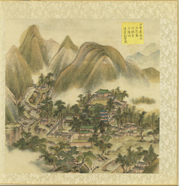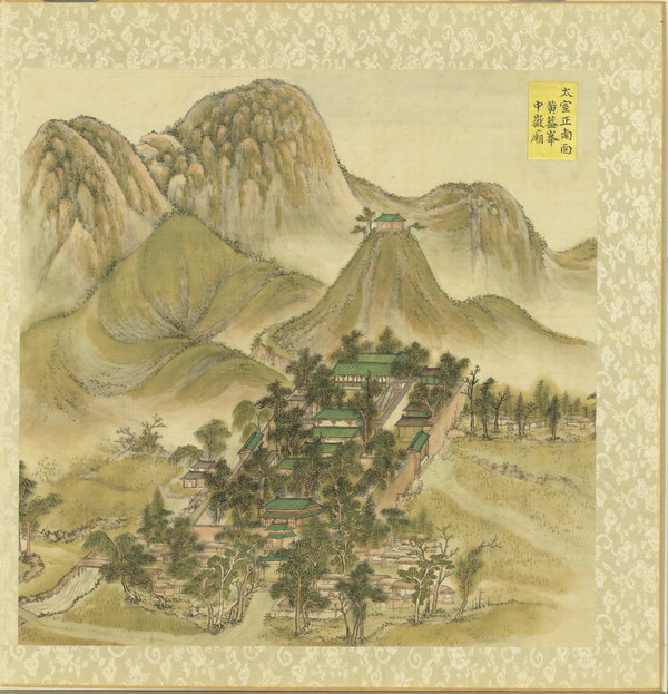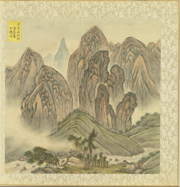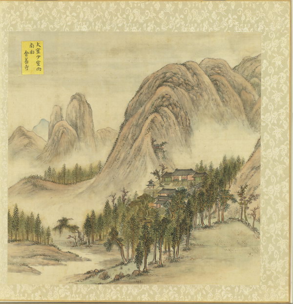 全册共十二开,依次描绘无名寺、中岳庙、少林寺、龙泉寺、会善寺、法王寺、嵩岳寺、莲花峰、少阳河、轘辕关、嵩山南面、北面等景点。画山中胜景古迹,同时写明方位或景点。作者未署名款,笔墨温润,色调清雅,接近明代中期吴派山水画风。