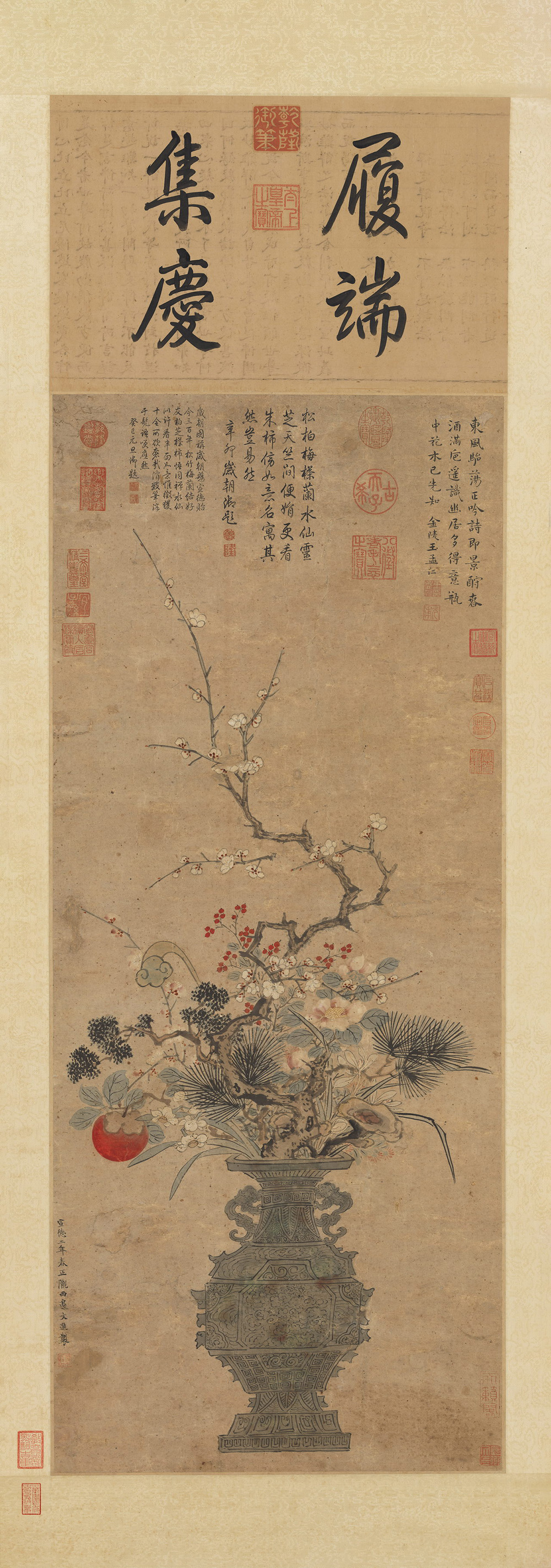 本幅作于明宣宗宣德二年春正,正当一年之始,除旧布新之时,以岁朝时节摆设厅堂的瓶插来表现庆贺之意。古朴的铜壶内插梅、兰、山茶、水仙、天竺、灵芝、松、柏、柿子、如意等十种花材,象征十全。瓶花的重心偏于下方,上方以梅干引向高处,虚实相应。笔墨沈稳,确有学习明初著名的宫廷花鸟画家边文进之意,但仍有差异,款字显是后人添加。