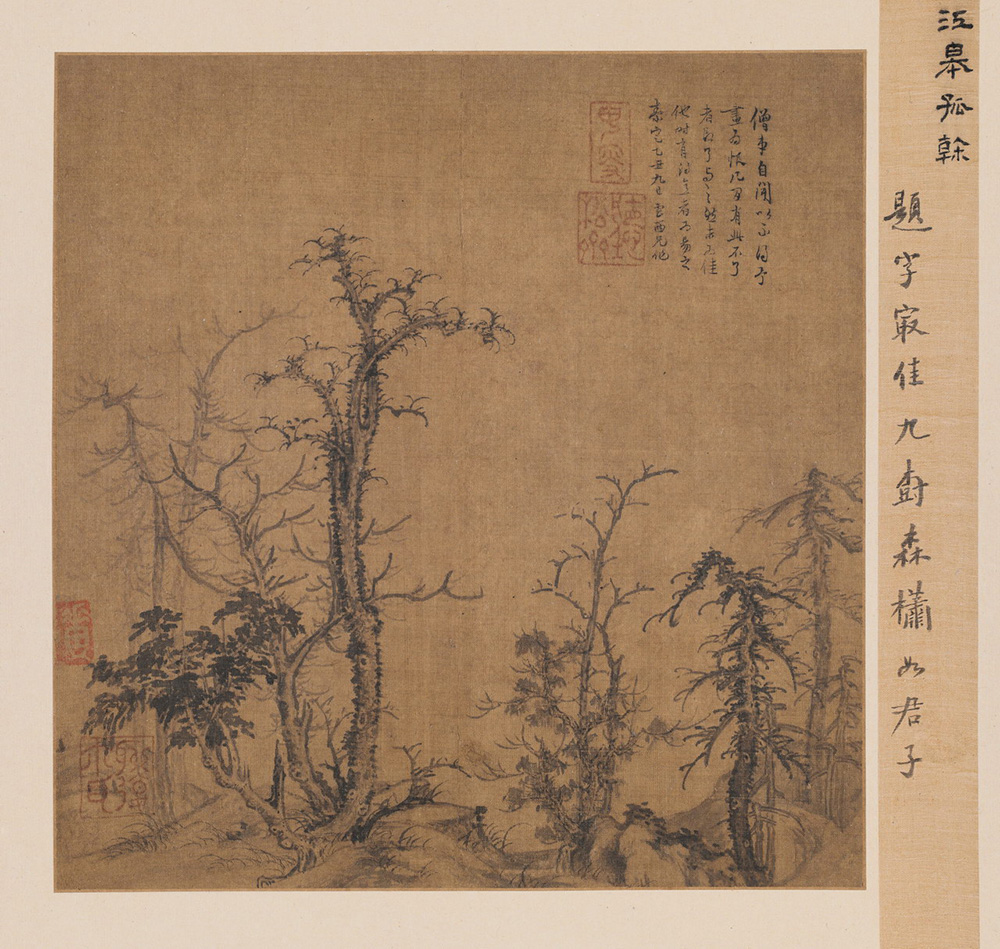 绘坡石寒林,已经荒寒萧瑟。枯枝苍劲挺拔,上仰似鹿角,下抑如蟹爪。坡石杂树穿插错落。其用笔丰腴圆润,学李成、郭熙一派又有变化。右上自识“曾弟自闻以不得予画为恨,几闻有此不了者,即了与之,然未为佳,他时有得意者为易之。泰定乙丑九日,云西兄作”。钤“云叟”、“听松斋”朱文印二方,左下角又钤“聊复尔耳”一朱文印。