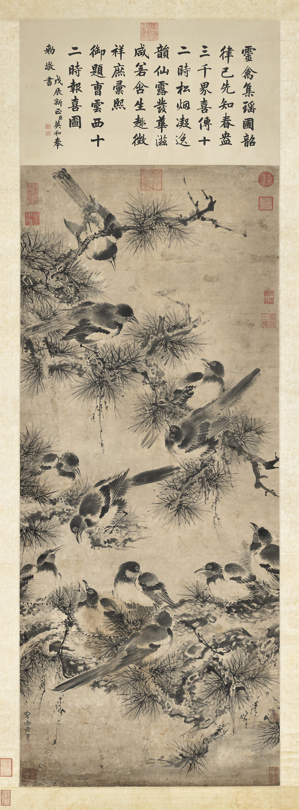 画轴描绘十二只喜鹊,它们或栖息于枝头,或展翅欲飞,对应十二时辰在松树上啼叫蹦窜,形成林间雀鸟欢跃之景。