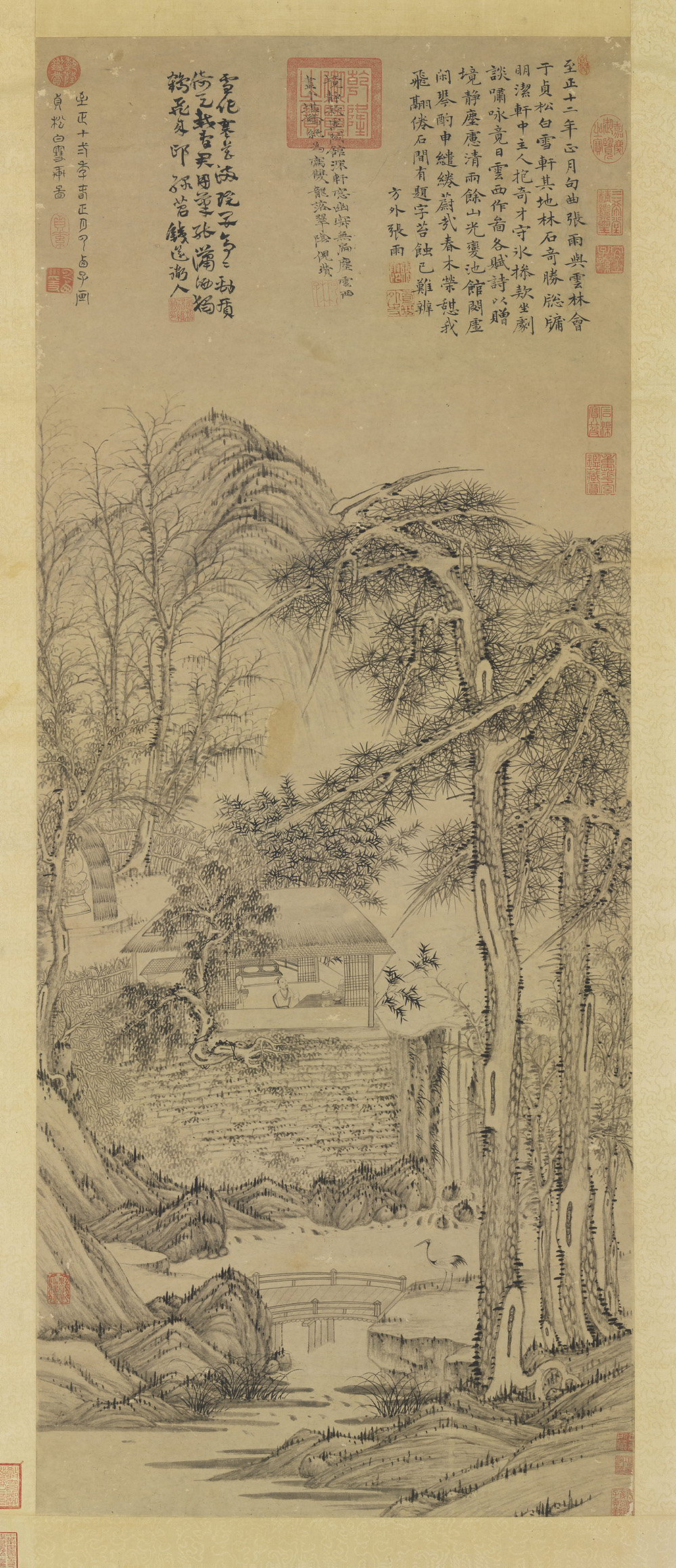 款识:至正十二年春正月。云西子画贞松白雪轩图。