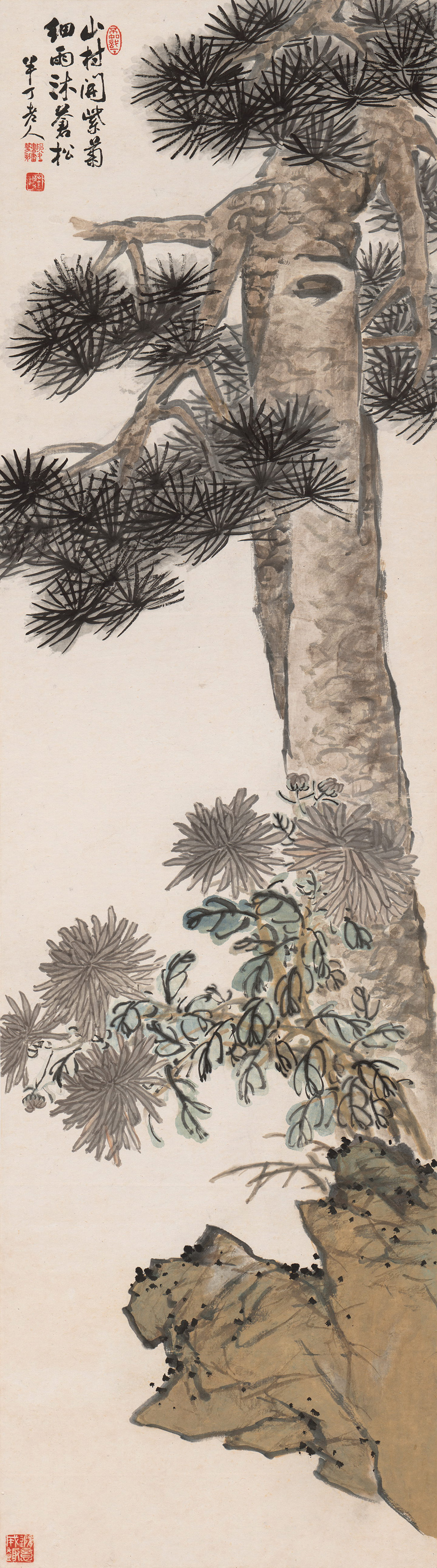画上自题:山村开紫菊,细雨沐苍松,半丁老人。绘山崖处苍松茂盛,树杆粗壮,松针翠绿;树下一棚菊花盛开,花瓣重叠交错,观之菊花清香扑鼻而来。