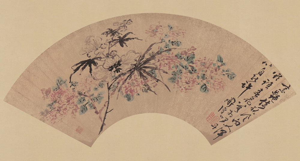 此幅画折枝秋葵和紫薇,一水墨,一设色,勾花朵点叶全以书法入画,草草似不经意,而能得其生動自然的意趣。本幅为“花卉冊”第六开。