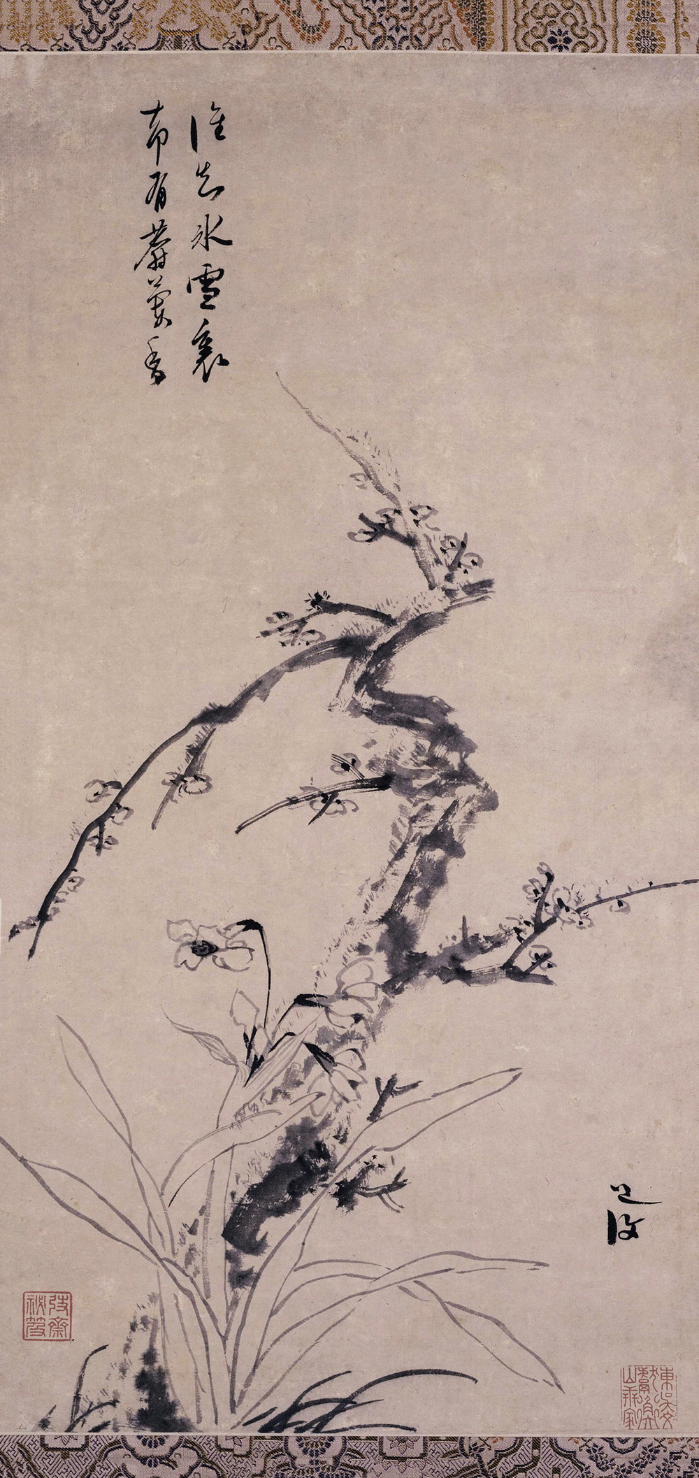 此幅梅花居于画面的主要位置,枝干向四周舒展,与水仙相呼应。画面通过顿挫、飞白等用笔展现出梅花枝干的苍劲肆意,梅枝时断时续,实则笔断意连,韵味十足。梅花以淋漓的水墨挥洒,生动逼真。怒放的水仙花用简笔勾勒,清丽脱俗,静谧隽永。