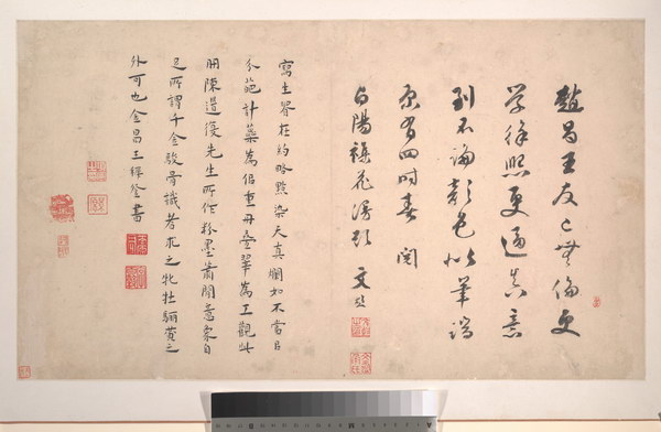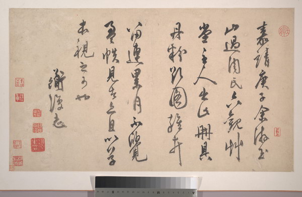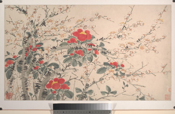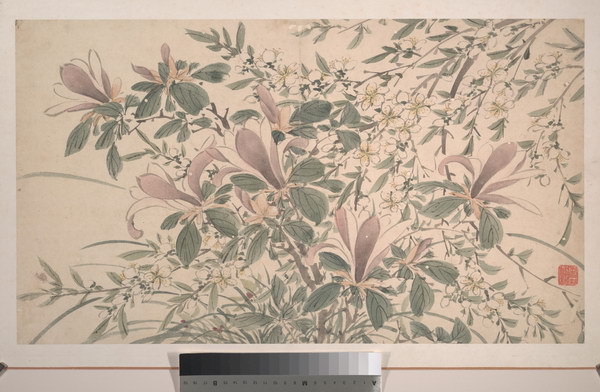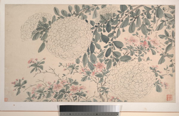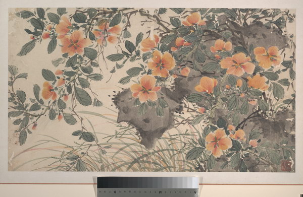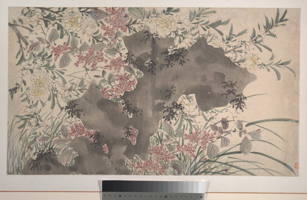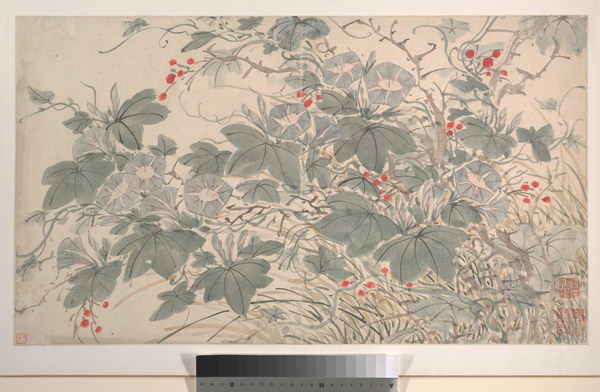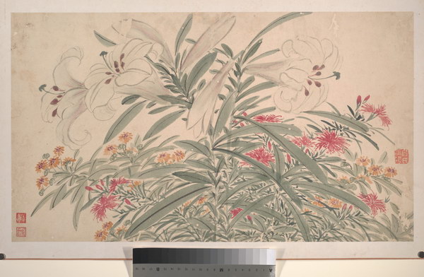 此册陈道复以小写意着色画各种花卉杂圃。全册皆是满幅构图,与世传陈画不类,故有学者认为非陈淳的作。自跋: 嘉靖庚子余游玉山,过周氏六观草堂,主人出此册具丹粉,欲图杂卉。留连累月,不觉盈帙,见者亦且以草本视之可也。道复志。 赏鉴跋: 文彭、王穉登、金农题,不录。作者印: 大姚、白阳山人、陈氏道复、复生印。 收藏印: 张则之、章氏子柏过目等。