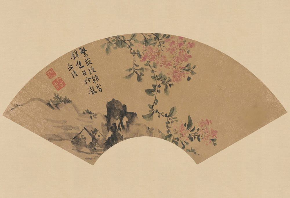 图上一枝紫薇倾斜式自扇顶垂下,花开灿烂,色彩艳丽;扇面左侧以墨色涂抹似山坡坚石,使整个画面不显空乏。