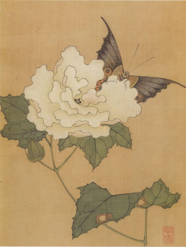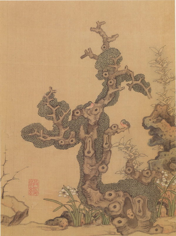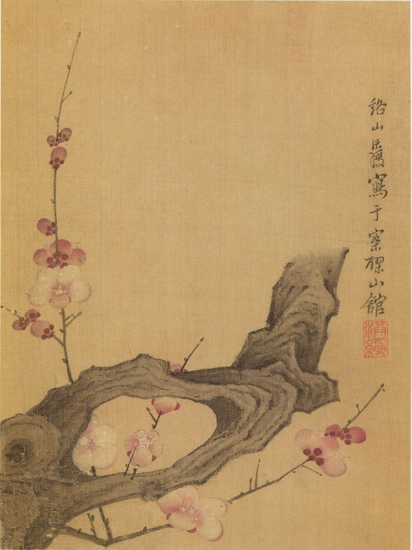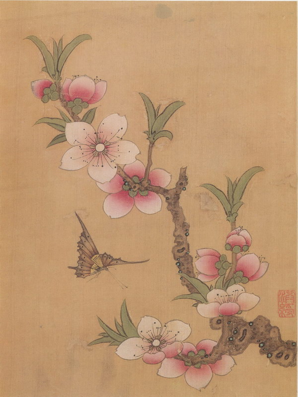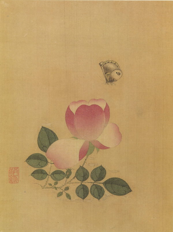 此册页原为看篆楼旧藏,共十二开,计有:朱茶蝶抱、蝶点春花、瘦古奇石、秋芳倚石、丹洁无尘、小蝶采香、古虬花红、淡紫孤芳、幽禽独梢、清芳结竹、古槐双栖、梅绝世姿,款署“溪山洪绶写于榕醪山馆”,每一开钤“洪绶”朱文长方印,画面精妙绝伦,显现着炉火纯青的技法和天然的灵气,直逼神妙入化。