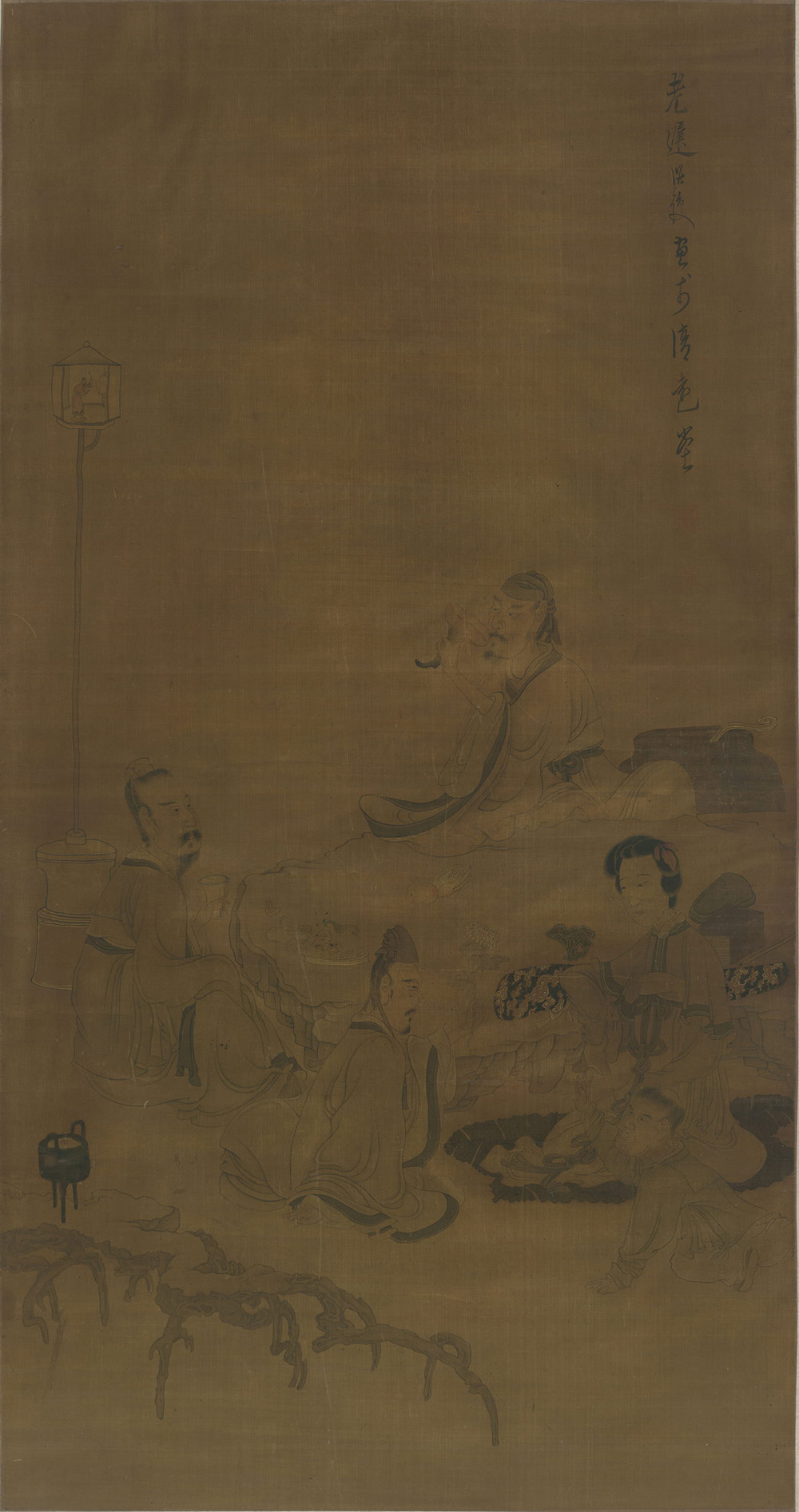 此图谓老莲画堂图,不知何意。看画面描绘的情景应该是有琴妓参与雅集饮宴一类的文人活动,一长竿上有个传动装置能使透明罩内的木偶进行击鼓,具体何物还待考。爬在地上的孩童画成成人的模样,以老莲真迹《童子拜佛》图观之,老莲画儿童不至于如此不堪,或画的是侏儒,不得而知。此幅可接受为老莲真笔,而种种不解,还待方家释疑。