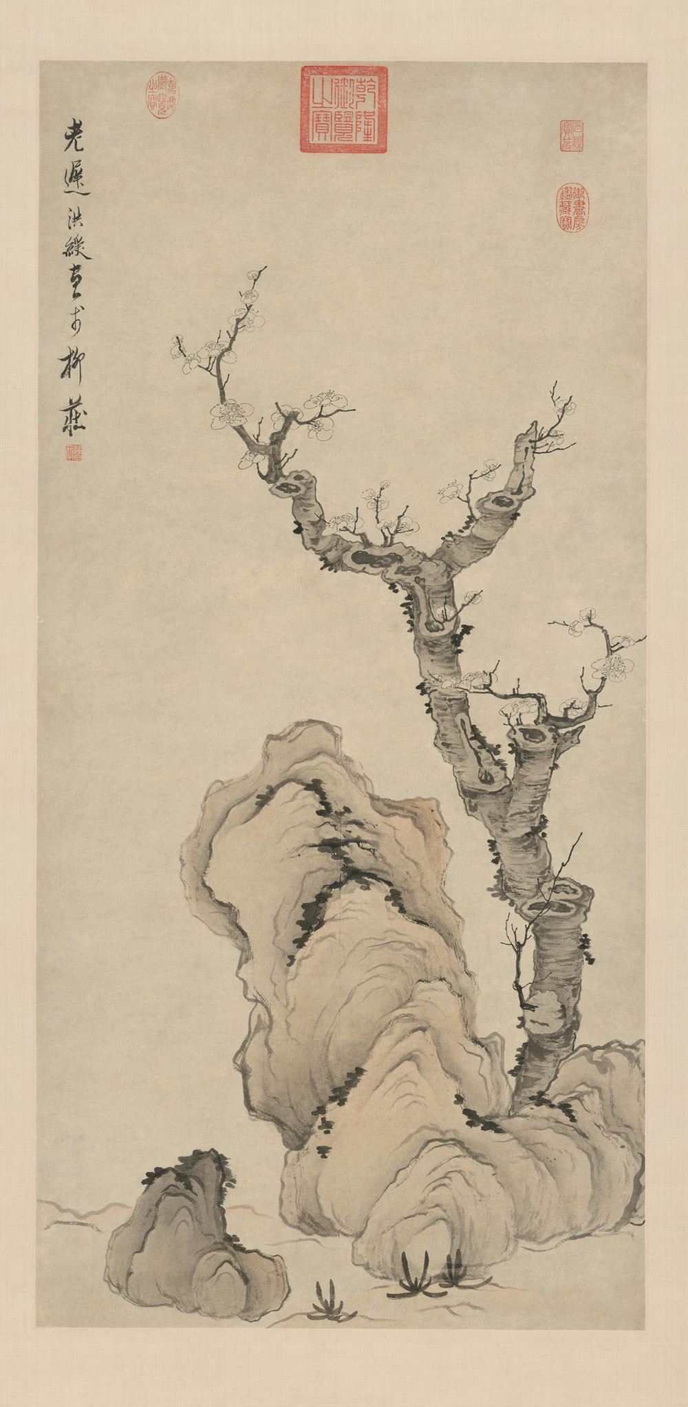 是图以古拙奇特的造型绘拳石耸立,旁伴一株被截去诸多枝干的老梅树,树上几朵梅花绽蕾展瓣。构图简约洗练,并注重物象间的相互衬托与对比。画石用线勾出圆润的外形,再以淡墨渲染。画梅则用浓、枯墨笔勾勒,线条古拙方硬,具金石韵味,体现了老梅饱经沧桑的古木气息。