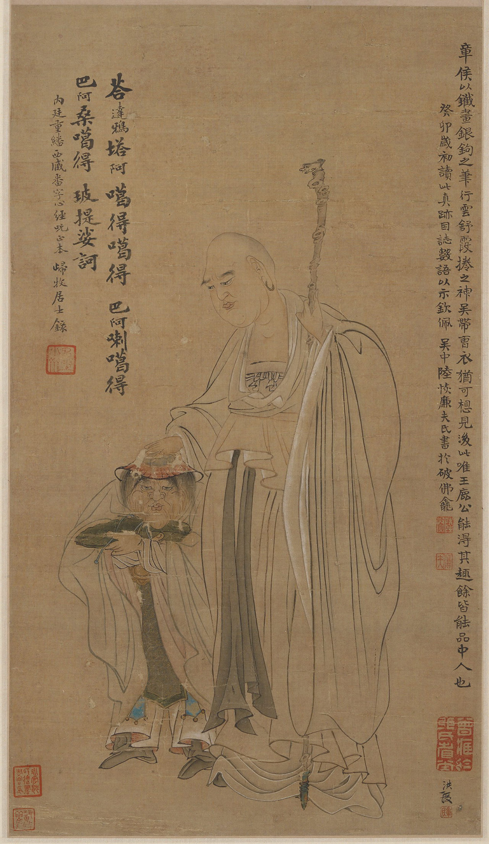 此图绘一僧人给新徒弟行“摩顶戒”礼。用笔无陈老莲方圆浑溶之感,线质过于流利,疑是老莲传派之人所做,而落老莲款。画幅右方有清末画家陆恢题跋,述对老莲高山仰止之情。右侧有归牧居士录藏语心经咒。
