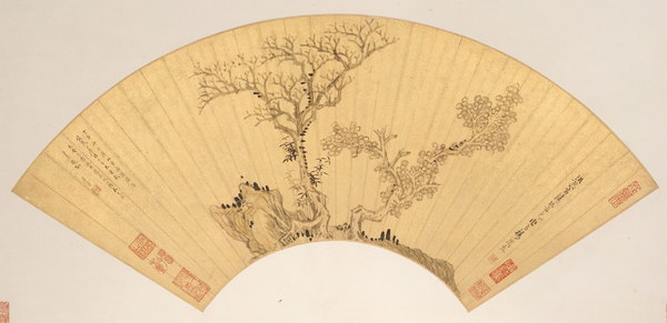 五、绘有梅花一枝。梅花枝干粗壮枯老,抽出若干短小枝条。小枝条上白梅盛开,花瓣用淡墨勾勒,浓墨点花蕊花萼,极有韵致。观之如闻梅之幽香。