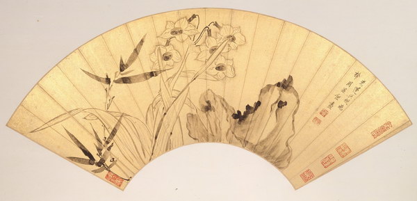 九、中绘有梅花、水仙、菊花三种花卉,还有湖石一座。石后的白梅,淡墨勾勒,浓墨点蕊,梅花周围用淡墨渲染,更凸显梅花的洁白芳香。水仙用笔粗括,叶片宽厚,花朵硕大,攒聚枝头。菊花在右,花瓣用墨疏淡,叶片淡墨积染,墨色浸润。