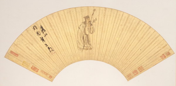 十二、单单绘一人物,一手执杖,一手举梅花一枝,好似在闻梅花的香味。人物衣衫线条流畅,人物表情专注。