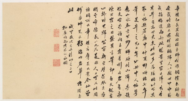 二、为秋日之景,画面澄明,天高云淡,树木皆有秋色,一片清逸之气。画中山石对垒,用浓墨、淡墨皴擦。水面留白,水上一舟自横,舟上士人静坐闲观。画境清疏淡远。