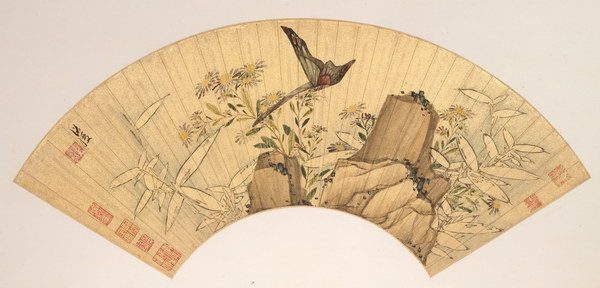 八、画风清丽柔媚。画而石块用墨细腻,造型奇美,用石绿点笞,颇有秀色。石后雏菊绽放,斑斑点点,秀丽异常。画中竹叶,浓墨勾线,叶子留白不填色,别致清雅。