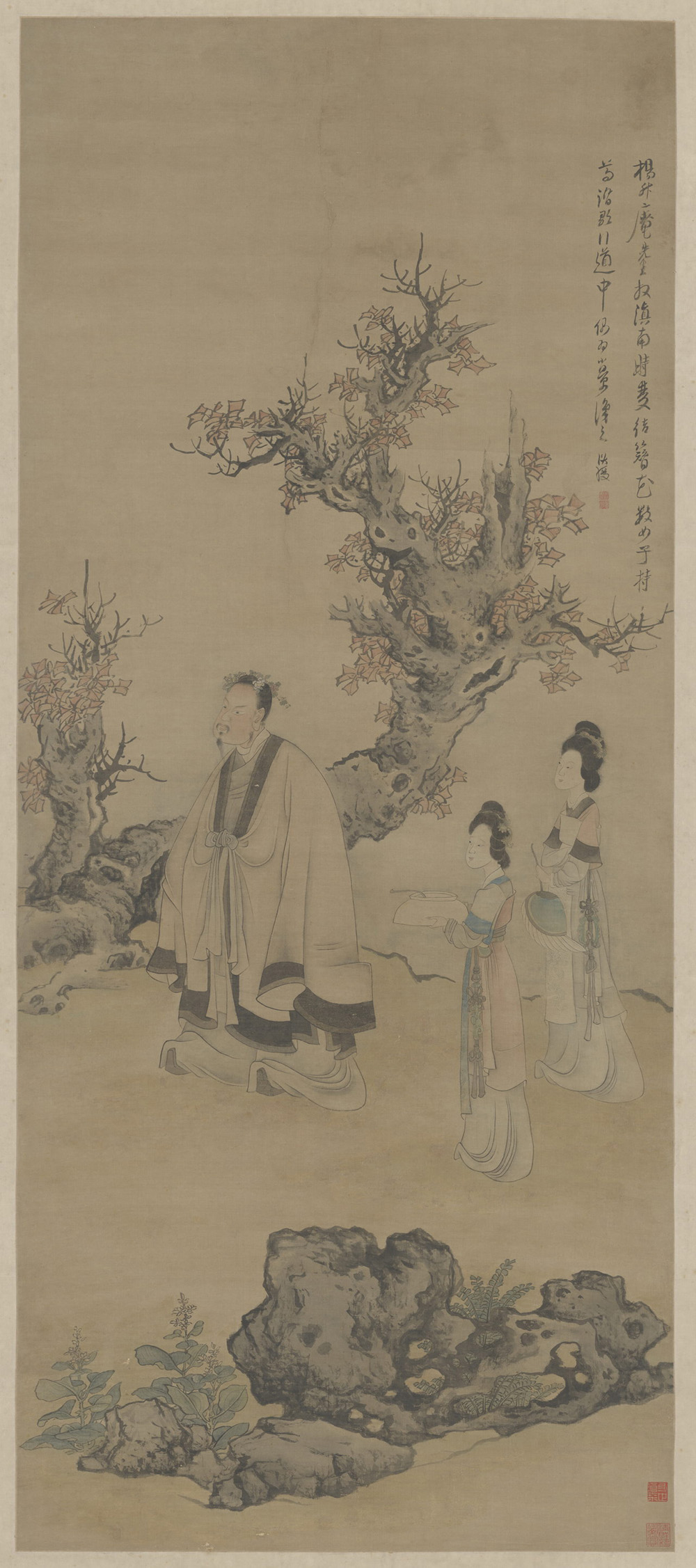 明代著名文学家杨慎(1488—1559年),号升庵,被流放云南时为讥讽时政,曾醉酒后以白粉涂面,髻上插花,与学生和妓女游行于市中。此图即绘其事。图中人物造型夸张,神态生动,线描圆劲流畅,背景中老树枯槎虬枝,更衬托出主人公桀骜不羁的个性,显示了陈洪绶人物画成熟时期的典型面貌。