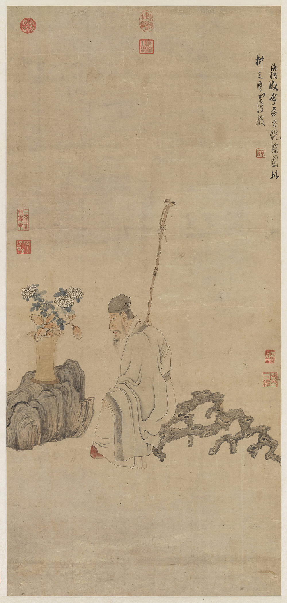 此图绘陶渊明坐古树根上赏瓶菊,人物用线劲古,设色清雅,表现隐士清淡无为之神情。