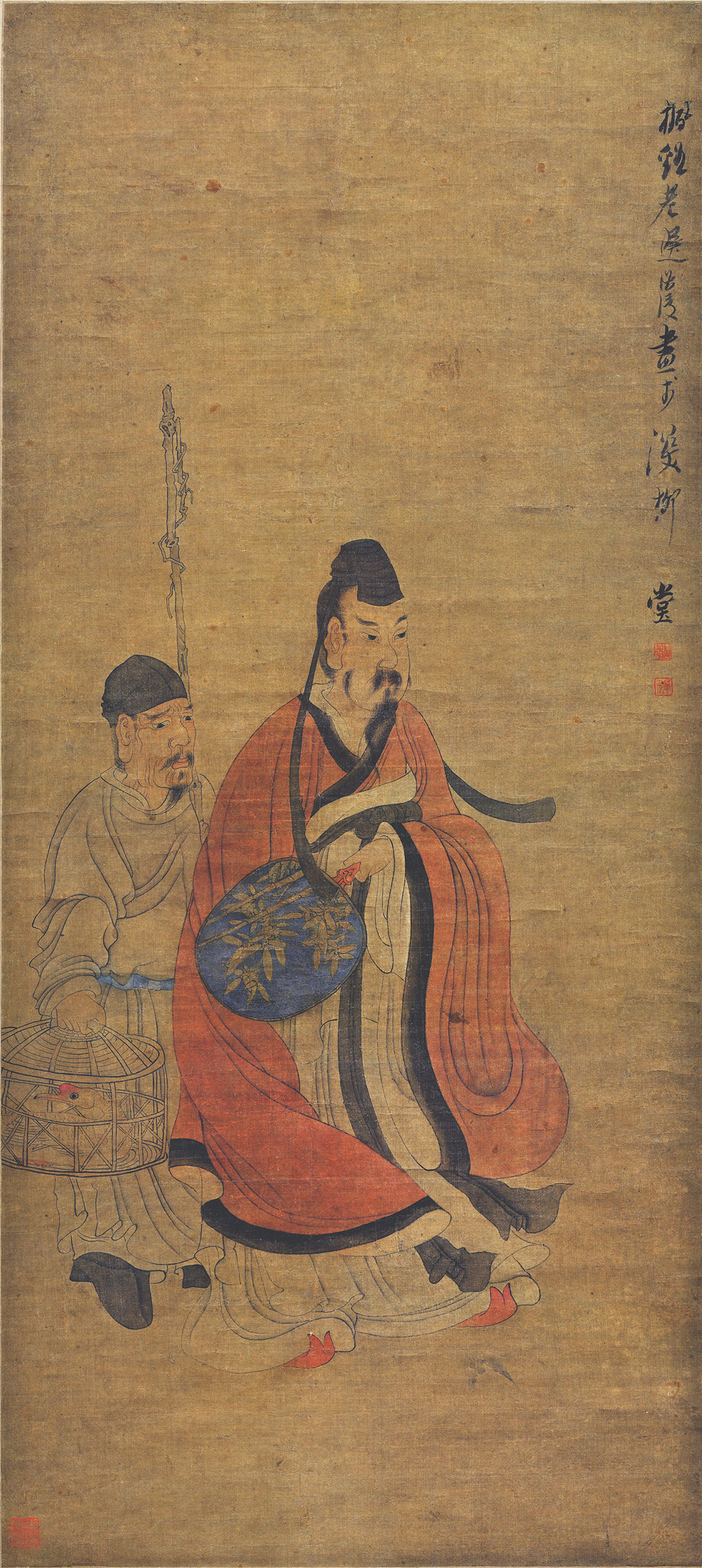 此图采用中国画传统的立轴形式,表现了晋代书法家王羲之携家仆笼鹅而归的情形。作品右上款署“枫溪老迟洪绶画于深柳堂”,下钤“陈洪绶印”白文方印、“章侯”朱文方印。