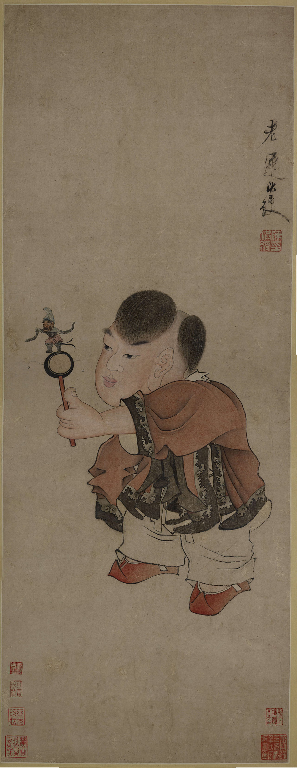此幅画面简略,绘一小孩童手拿拨浪鼓(鼗),在摇动玩耍。人物头大身短,衣纹用笔奇崛,这些都是老莲特有画风。拨浪鼓刻画细致,造型奇特,上方立一甩袖胡人,可见明末儿童玩具的精致与多样。