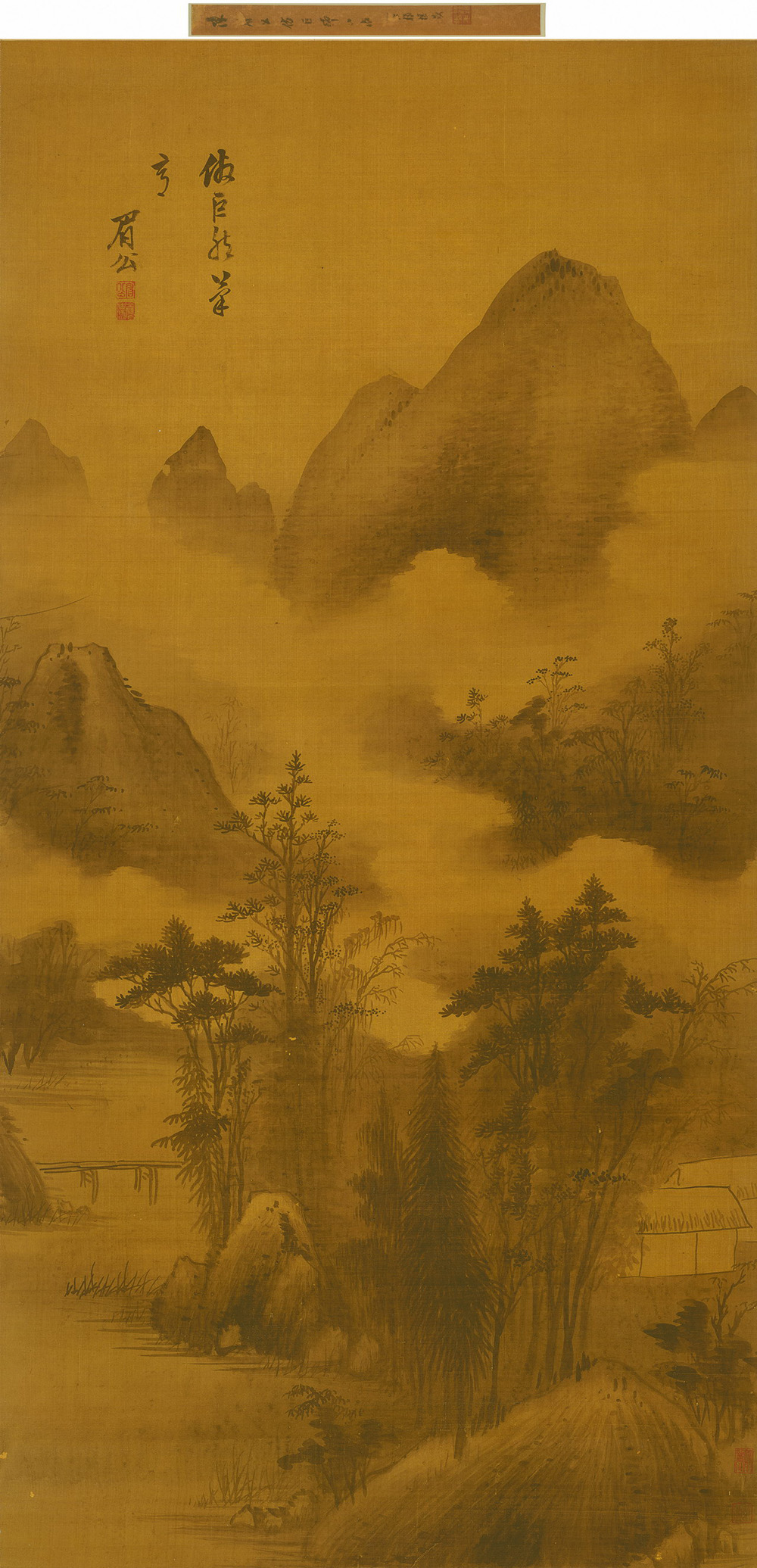 此图仿巨然笔意,画茂树浓荫和疏林淡影,间以屋舍小桥,而浓淡烟云悠然于山谷之间。全幅风格空远清逸,略近米家山水,结构谨严,意境清新,富有层次变化感。此画构图可分远景,中景、近景三段式。远景高山巍峨,山巅圆浑秀润,山上有拦腰白云,飘忽似山中岚气。整个山石烟云缭绕,呈现江南雨后苔滑之状。近景坡石和堤岸上杂树丛生,这参天古树,枝长叶茂,大树下又有几棵小树,形成一片浓荫,使烈日炎炎的崎岖不平的丘陵之中有歇息之地,使观者领略到树木垂荫之趣。远景与近景之间为一片空旷之地,作者以虚代实来表现空蒙的境界。署“眉公”,钤朱文印“眉公”,白文印“腐蚀”。