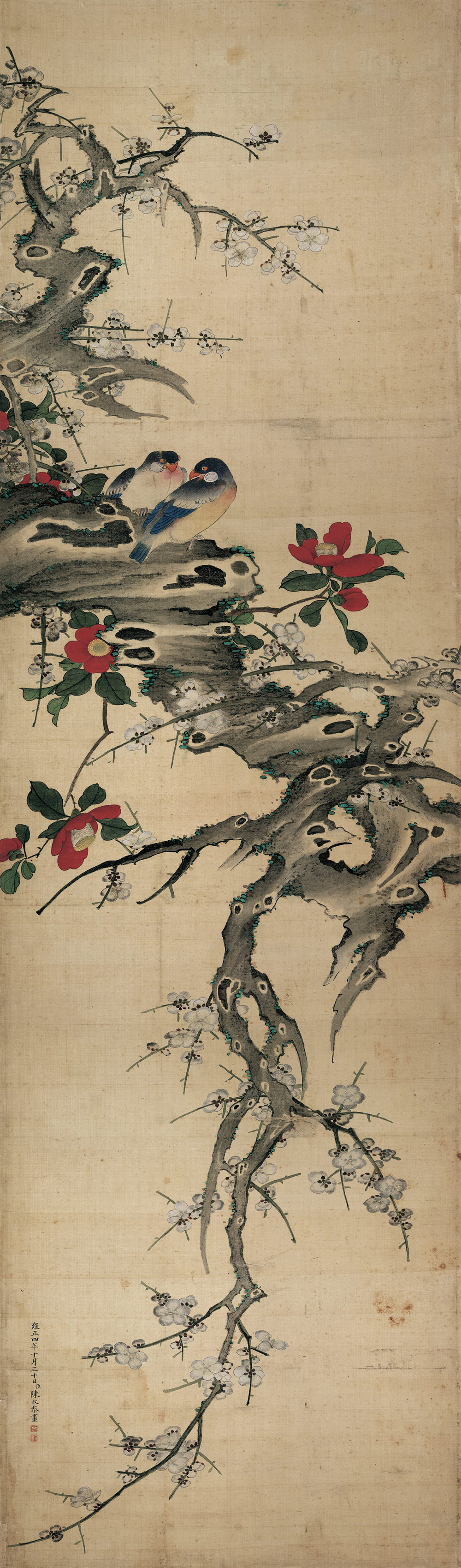 图绘老梅,山茶花傲立寒风中,一对伯劳鸟儿喁喁相依,寓意盛世太平。