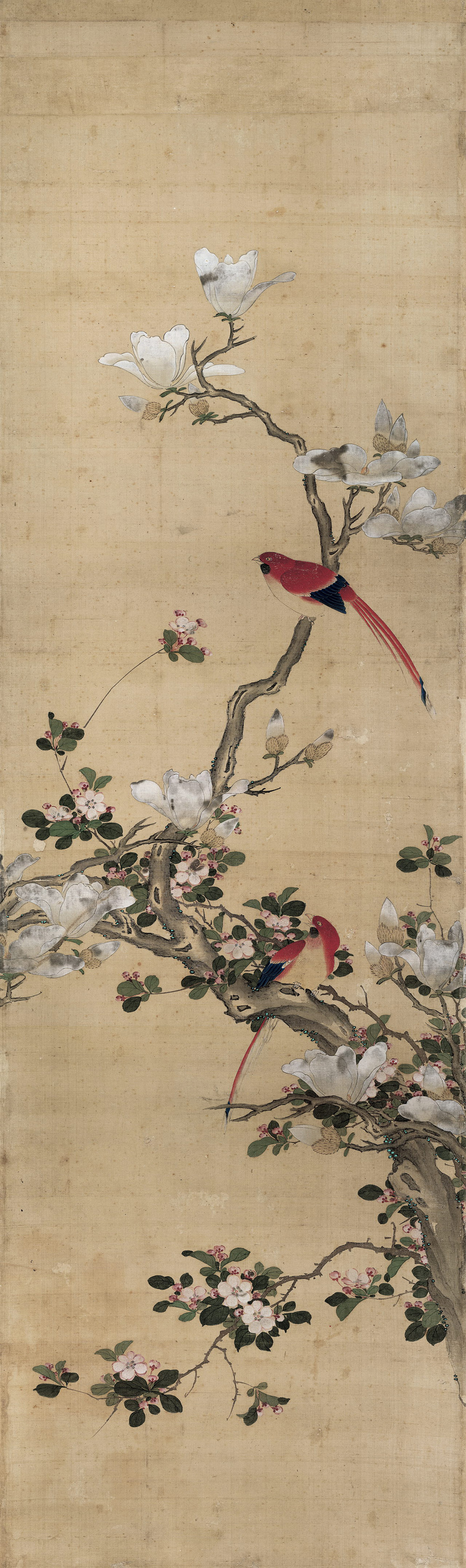 此幅绘红绶带、玉兰花。设色艳丽,唯禽鸟造型已具程式化。