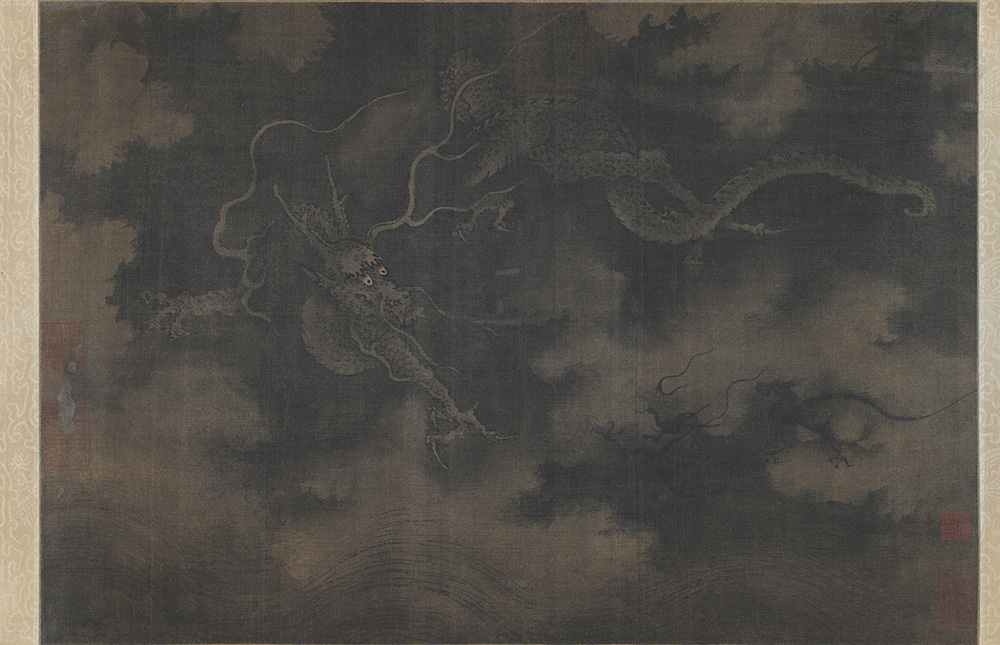 画面绘一条四爪巨龙曲颈昂首腾跃于空,龙阔口长须、肘毛如剑,硕长的龙躯隐现于翻滚的云气之中,其笔力雄健,虚实相宜。画中的龙腾跃于太空,搅动云气,须目怒张,鳞爪锐利,势不可挡。