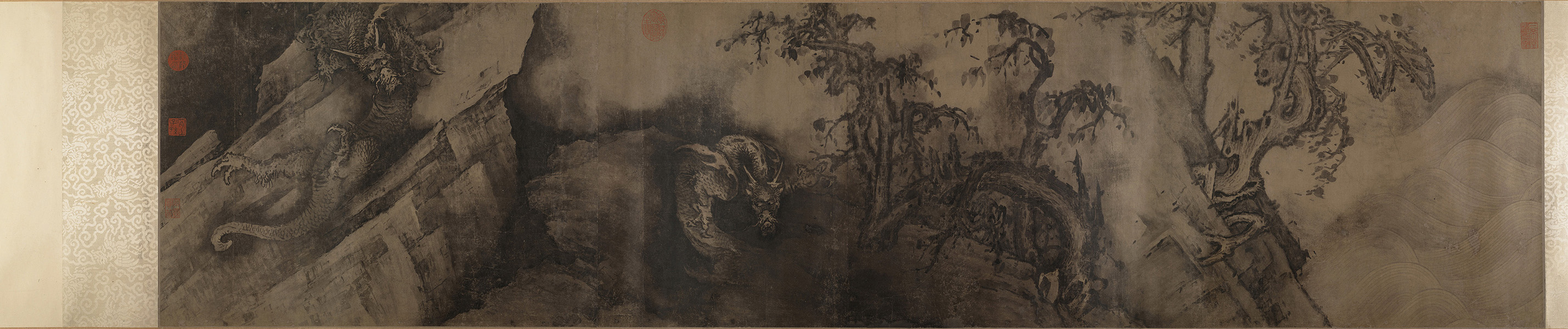 此幅无名款,传为宋代画龙名家陈容作品,与波士顿九龙图标准件相比较,此幅最为接近波士顿馆所藏。巨岩古树,云雾滔浪,二苍龙盘蟠于岩间石隙,墨色苍古,笔黑淋漓。可视为陈所南传派之精品。收藏印: 清内府诸鉴藏玺。