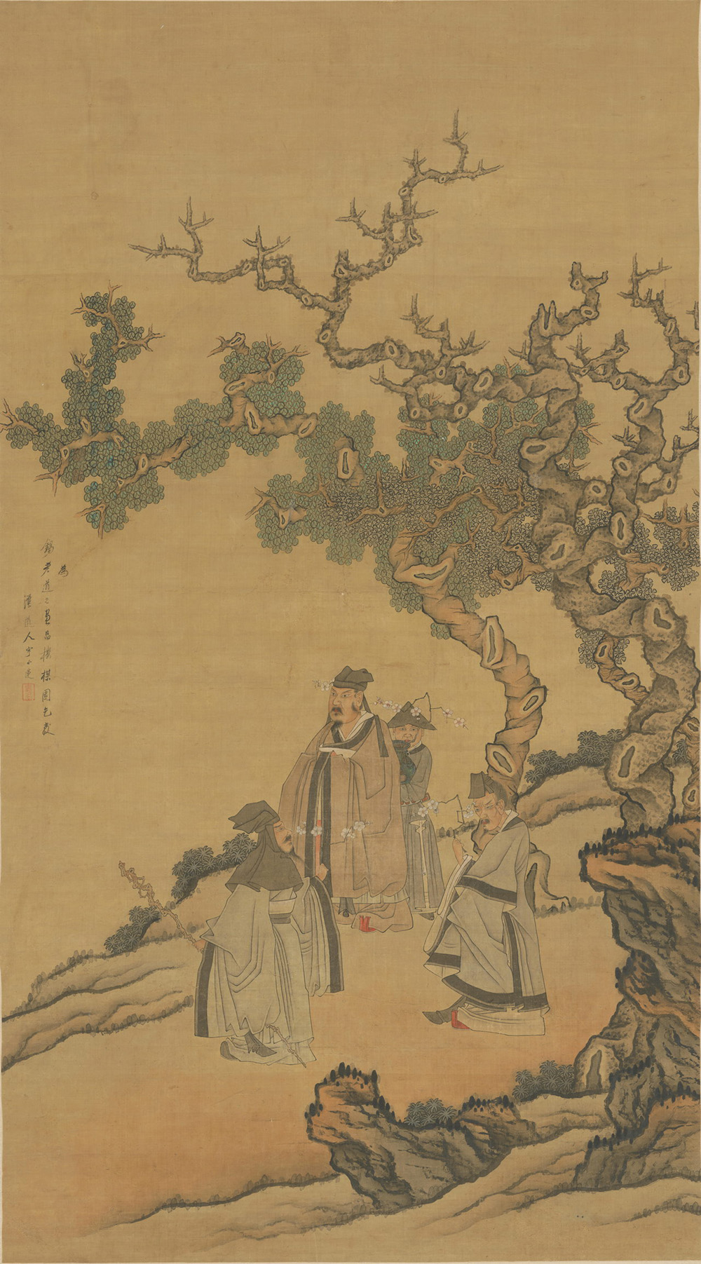 所绘人物四人,三位主要人物呈三角形构图。其中二人手持梅花对祝品赏;一个正面微侧拱手而站,后一侍者手持梅花。整个画面除人物外无背景,从人物造型、开脸及衣纹乃至款识书风看,全承其父风格。