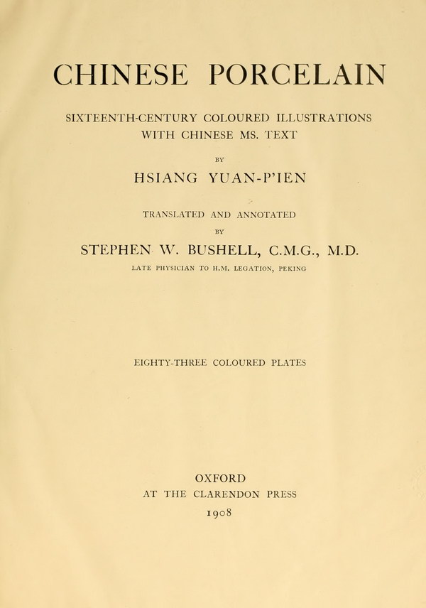 明项元汴撰《历代名瓷图谱》的英译本《Chinese porcelain》(卜士礼:Stephen Wootton bushell译编),介绍据传为晚明项元汴所见所藏宋、元、明诸窑名瓷图片83款,图施彩绘,中英文对照。注:卜士礼在中国陶瓷研究上的确有开创性的贡献,然而这部所谓项元汴《历代名瓷图谱》,已经被达维德爵士证明是一部伪书。参考英国东方陶瓷学会会刊(1933-34)刊载论文:Percival David, “Hsiang and His Album,” Transactions of the Oriental Ceramic Society 11 (1933-1934)