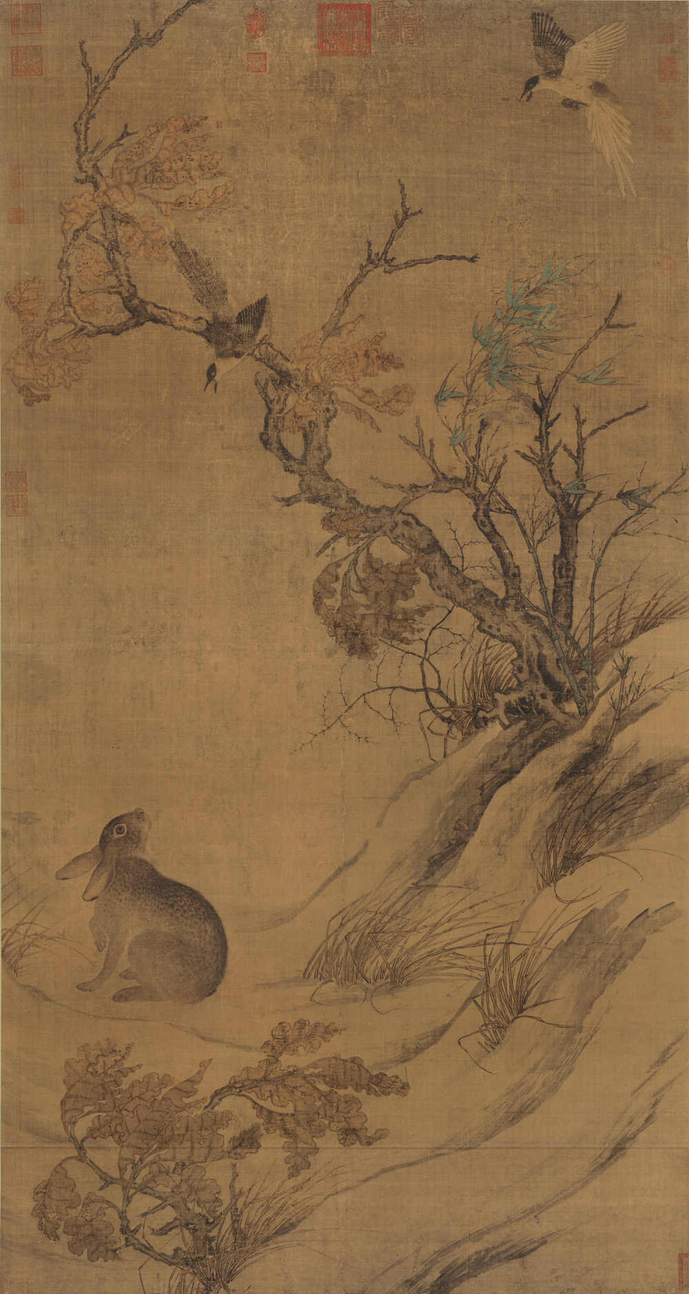 绘深秋时节,寒风萧瑟,枯木衰草,落叶调零,呈现出一派秋风肃杀的冷峭凄凉景象。整幅画面当中两只灰喜鹊之间,灰喜鹊与野兔之间,鸟、兽与自然环境之间,刻画的生动自然,情景交融,充分的表现出它们之间相互呼应的关系。 画中各物在作者的笔下蠢蠢欲动,大得自然野趣。编者按。石渠宝笼著录及画上题签均作宋人双喜图。兹以树干上有嘉佑辛丑年崔白笔题款。改为崔白双喜图。