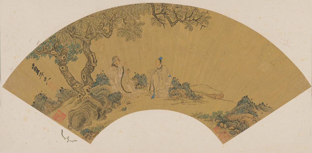 扇页有自题:“崔子忠。”钤“子忠”朱文印。图绘一年轻男子正向老者作揖行礼,老者则举手指点作回答状的场景,因此,本幅又名《说法图》。
