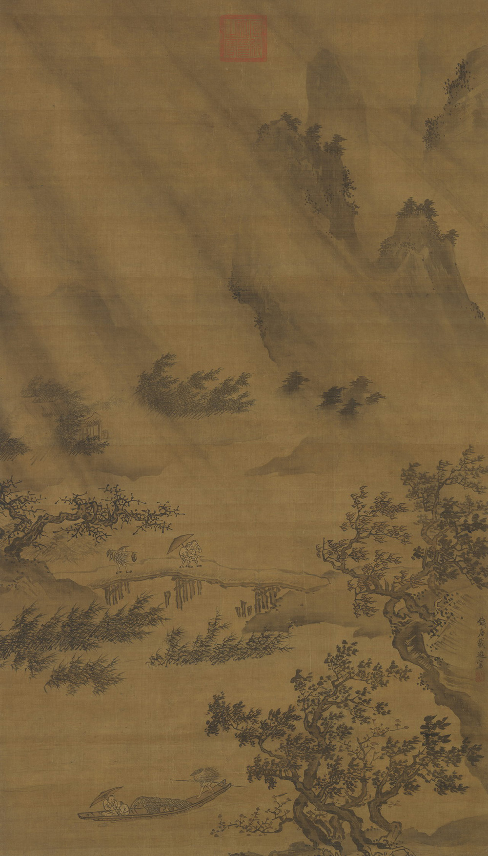 此画描绘暴雨降临的瞬间,风雨交加,江面上小舟颠簸摆荡,行人迎风而行的情景。 戴进这幅画以自然中的风雨云雾为创作主题,可以追溯到南宋夏珪的传统。