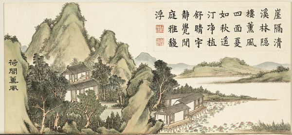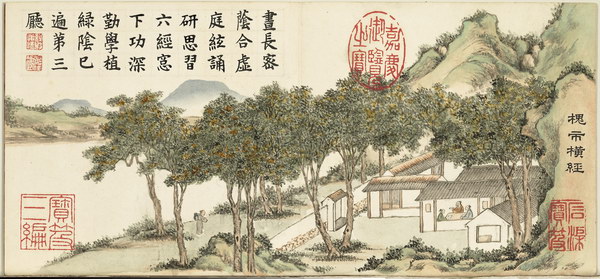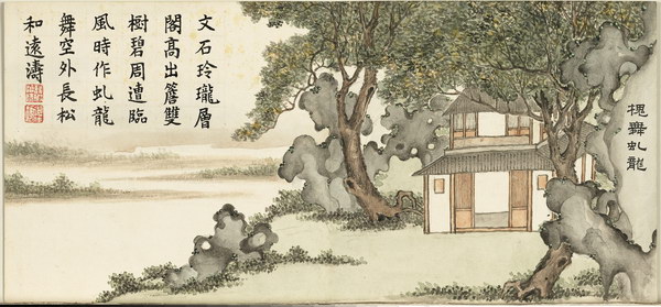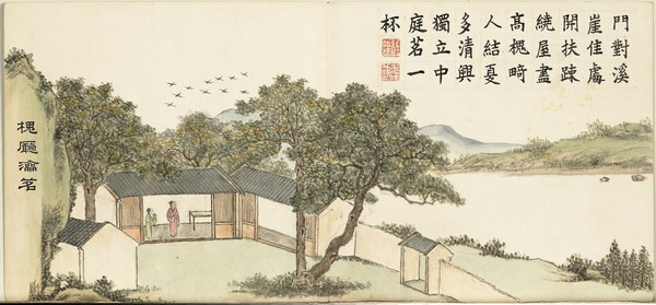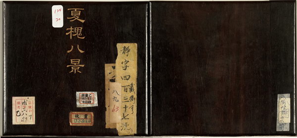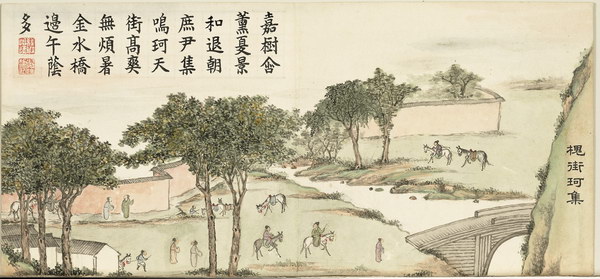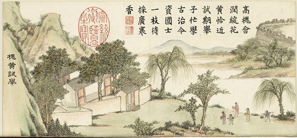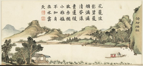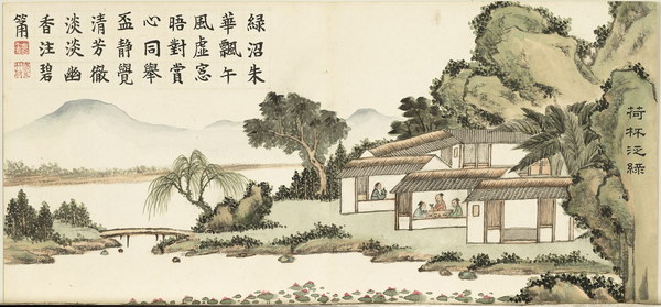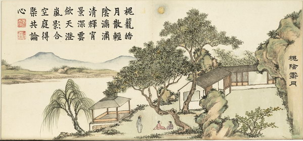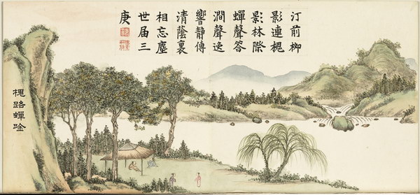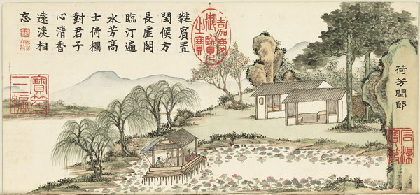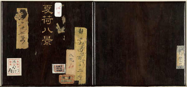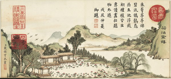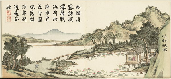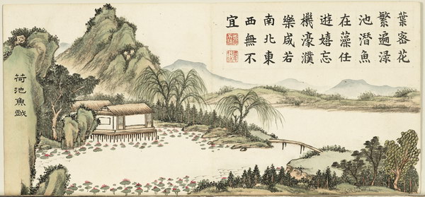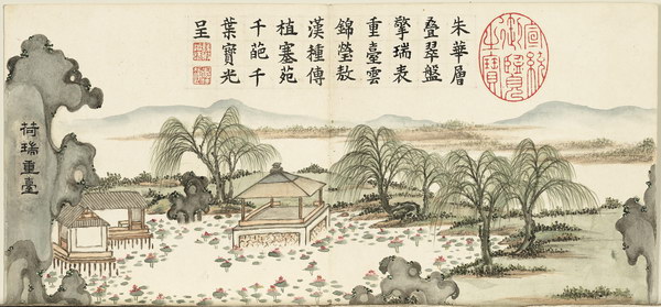 全套共两册各八开,依次为:荷芳闰节、荷瑞重台、荷轩快雨、荷阁薰风、荷杯泛绿、荷舫摇红、荷池鱼戏、荷沼禽嬉;槐市横经、槐黄试举、槐街珂集、槐路蝉吟、槐舞虬龙、槐阴霁月、槐厅瀹茗、槐谷飞甘。每幅配有清嘉庆帝题诗。