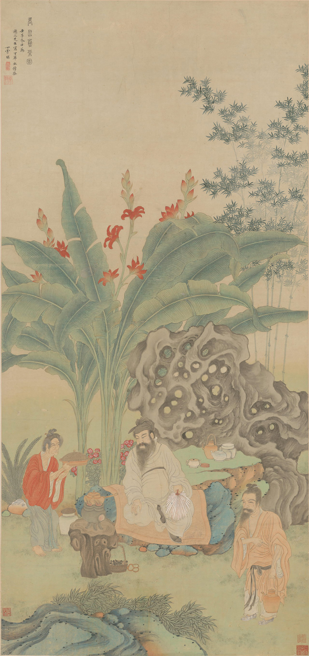图中描绘出唐代名士卢仝煮茶的情景,是丁云鹏晚年创作的工笔精细画作。款署“玉川煮茶图。壬子冬日为逊之先生写于虎丘僧寮,丁云鹏”,钤“云鹏”朱文印,“南羽”朱文印。另钤“三天子都外臣”白文印,“沈树镛印”白文印,“韵初审定”朱文印。壬子为万历四十年(1612)。