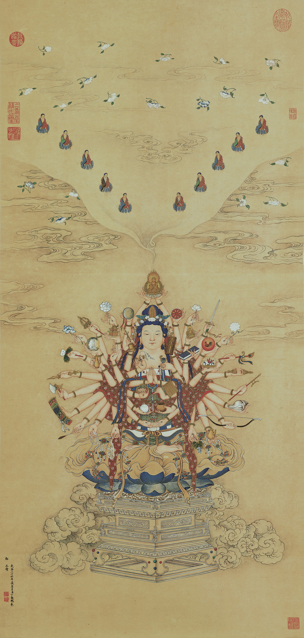 此图绘千手宝相观音一尊,各手分别持小斧、莲花、宝剑、弓箭等各种法宝;头上祥云朵朵飘荡,云中托出小佛十尊,花朵飞扬。观音面容和手臂作多层烘托,有较强的立体质感。说明作者在继承传统技法的同时,也吸收了西洋画的明暗、透视等特点,形成了自己的风格。