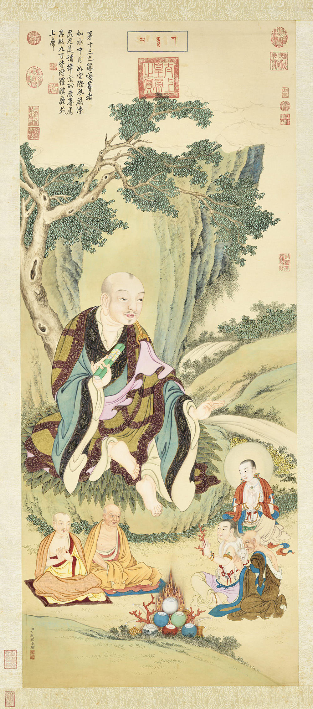 台北故宫藏其精绘十六应真配有山水背景、待从并一定故事情节,画幅上还有乾隆御题订正名和赞语,可见受重视程度。此幅是第十三巴纳塔嘎尊者。