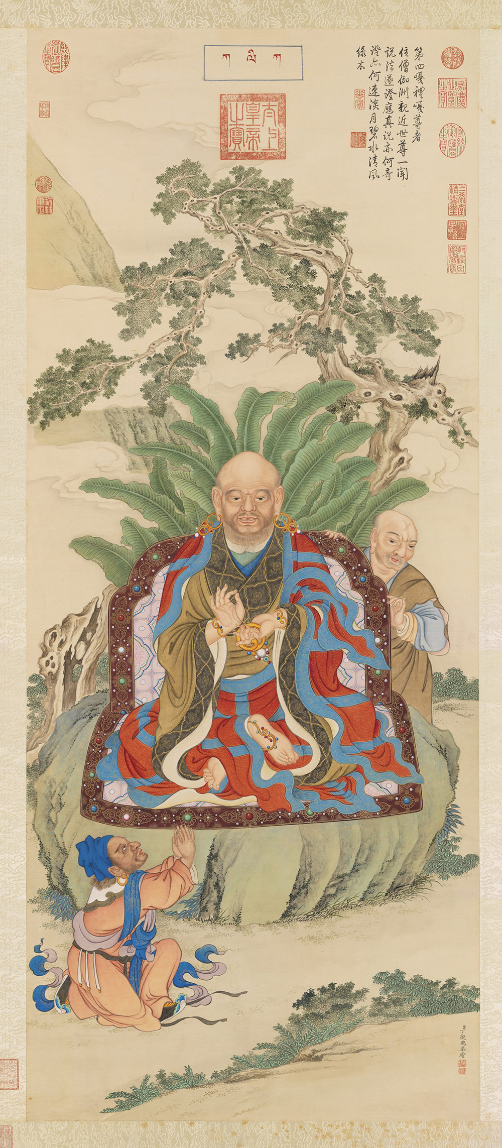 台北故宫藏其精绘十六应真配有山水背景、待从并一定故事情节,画幅上还有乾隆御题订正名和赞语,可见受重视程度。此幅是第四嘎礼嘎尊者。