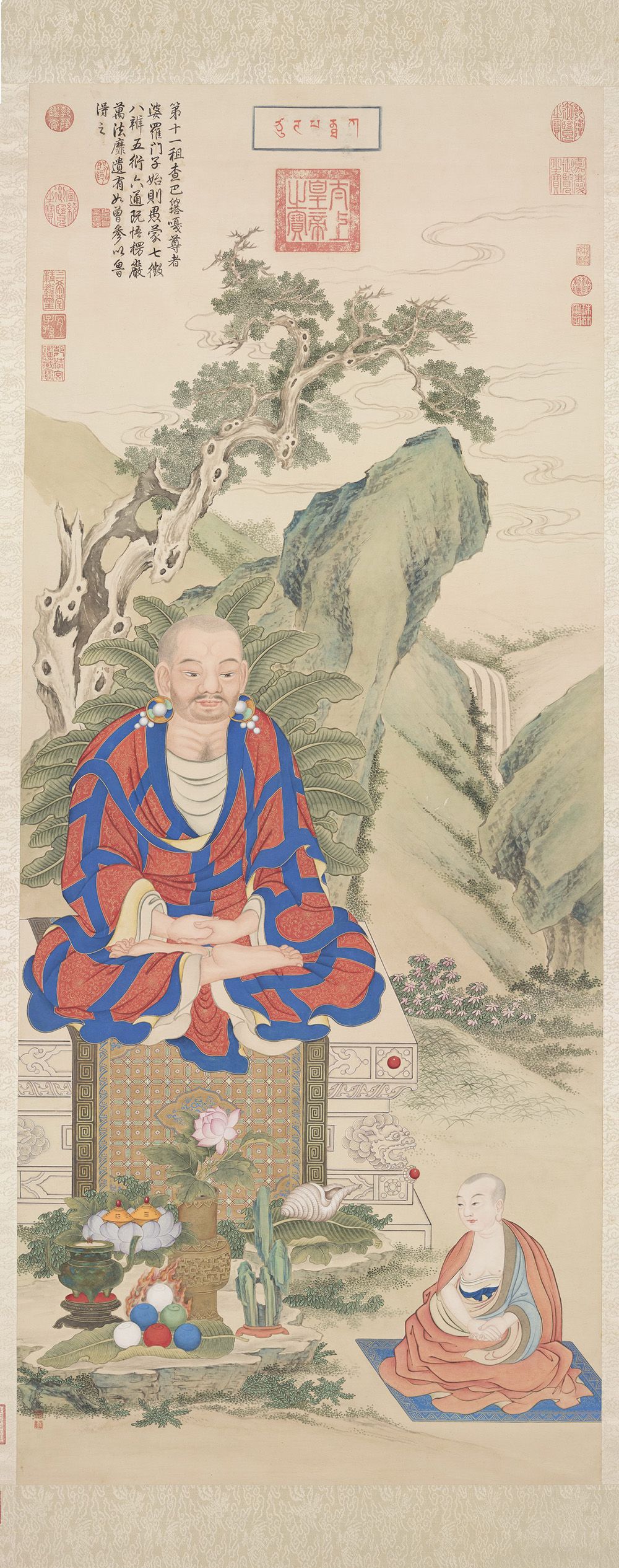 台北故宫藏其精绘十六应真配有山水背景、待从并一定故事情节,画幅上还有乾隆御题订正名和赞语,可见受重视程度。此幅是第十一租查巴纳塔嘎尊者。