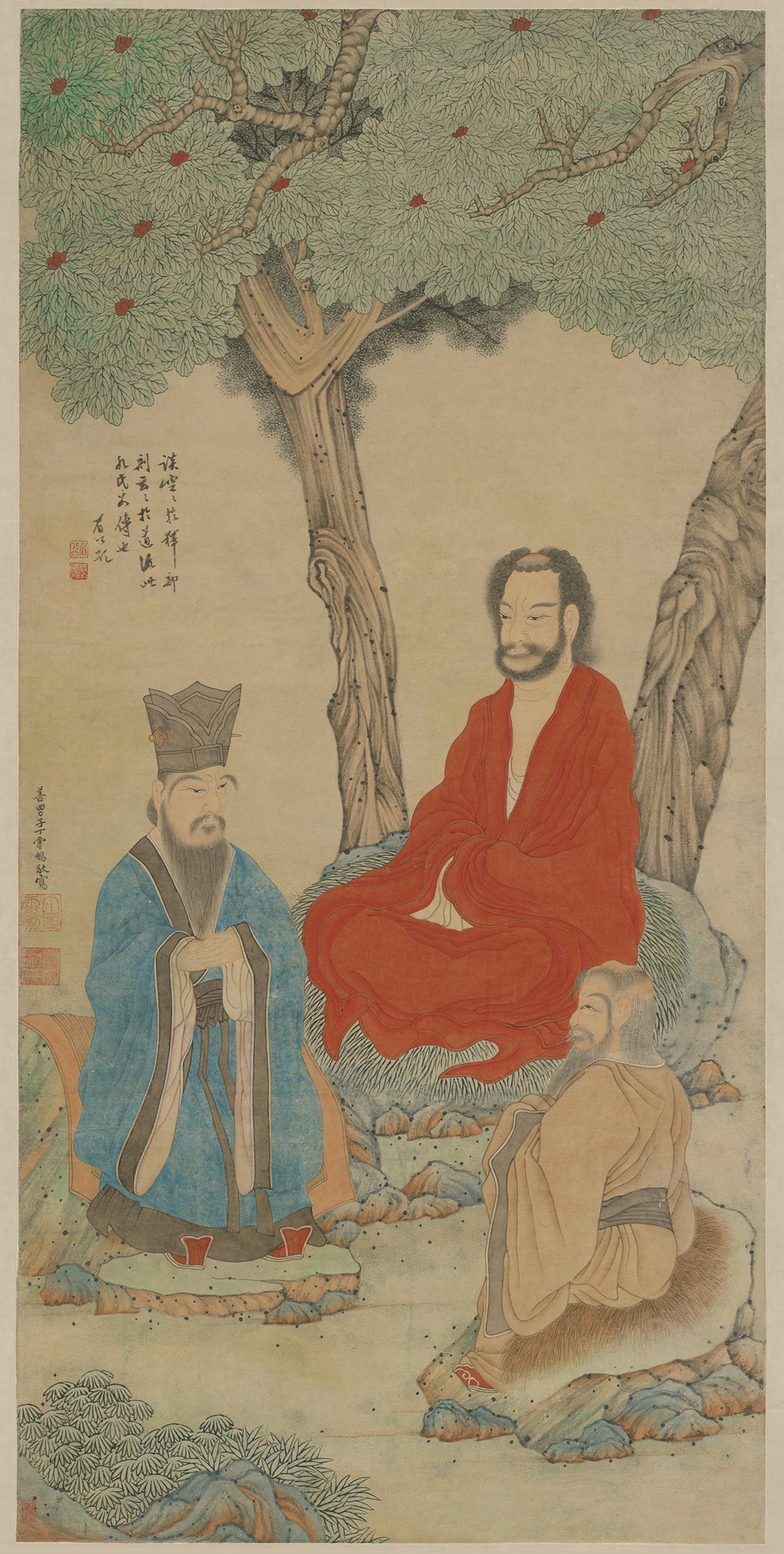 此图画孔子、老子、红衣罗汉坐于树下共同探究玄理的情景。图左下款署“善男子丁雲鵬敬寫”。钤“丁雲鵬印”“南羽氏”。画上有陈继儒题记。