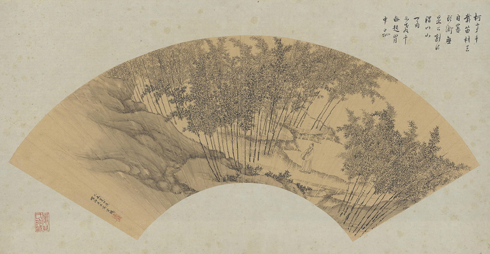 此幅是作者送给友人环海先生的画作,在此巧妙地使用有着“四君子”之一美誉的竹子为题材,以此赞赏友人具有象竹一样高风亮节、虚怀若谷的品格。扇页有自题:“乙未夏日为环海先生写。云鹏。”钤“南”、“羽”朱文联珠印。