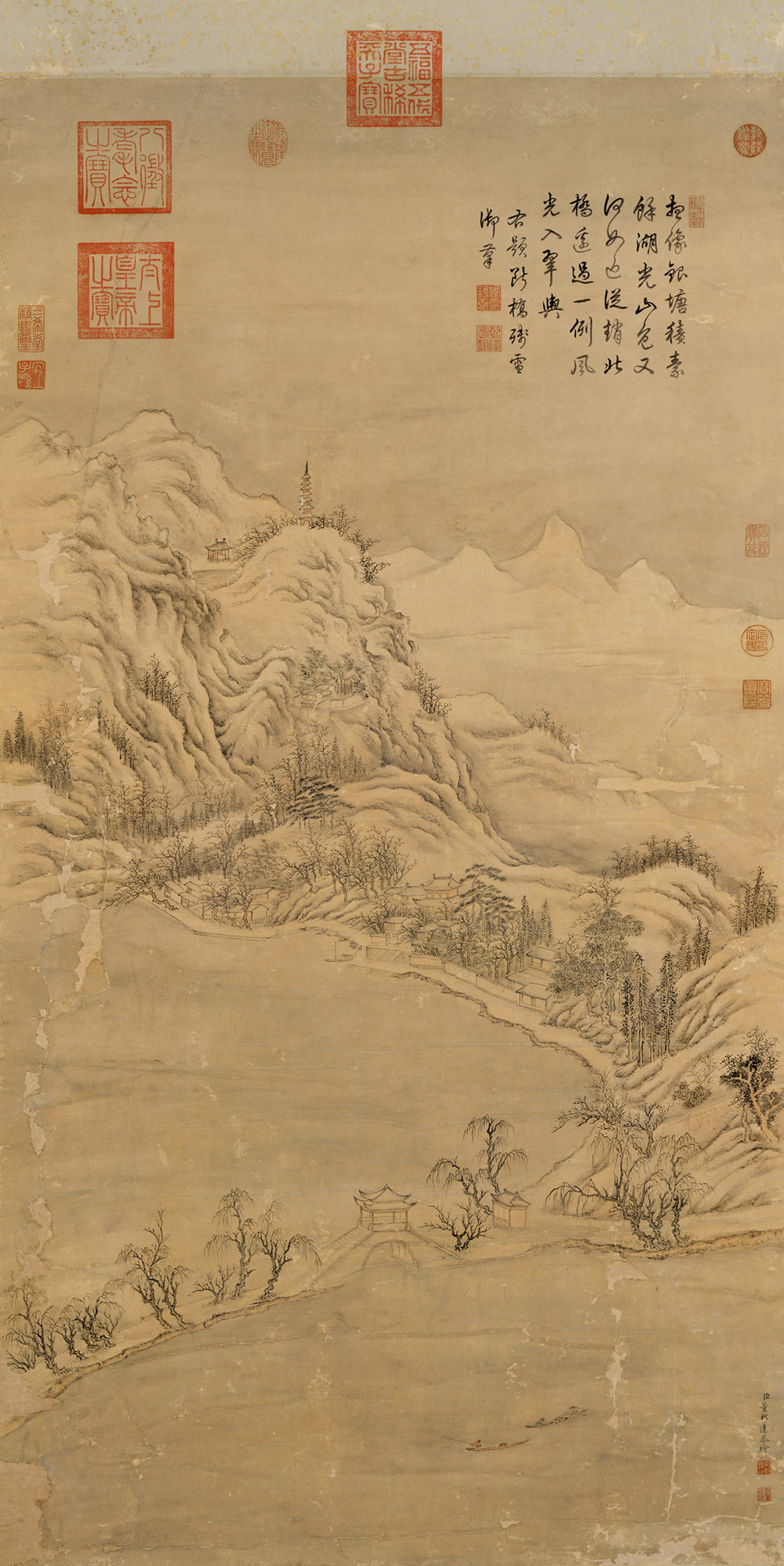 此为画家绘《西湖十景》之十《断桥残雪》篇,断桥即白堤第一桥。远方崇山峻岭,河边树木林立,数座亭台掩印其中,桥两侧水面平静,处处笼罩在寒冬薄雪中。
