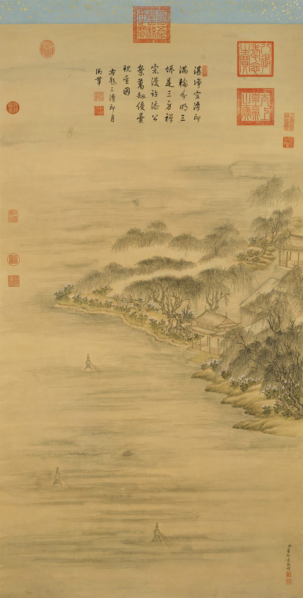题跋:湛浄空潭印满轮。分眀三塔是三身。禅宗漫许添公案。万刼优昙现圣因。右题三潭印月。御笔(印记:得象外意、乾隆宸翰、云霞思)