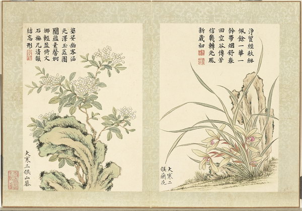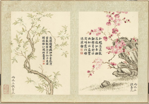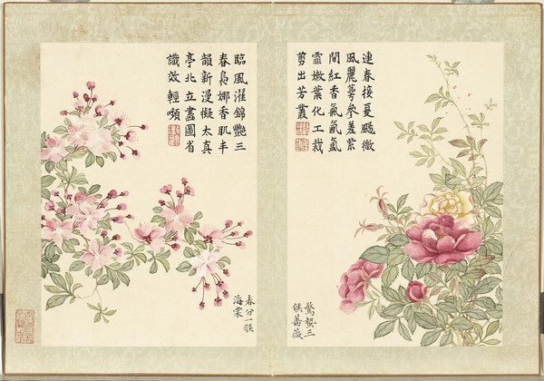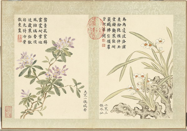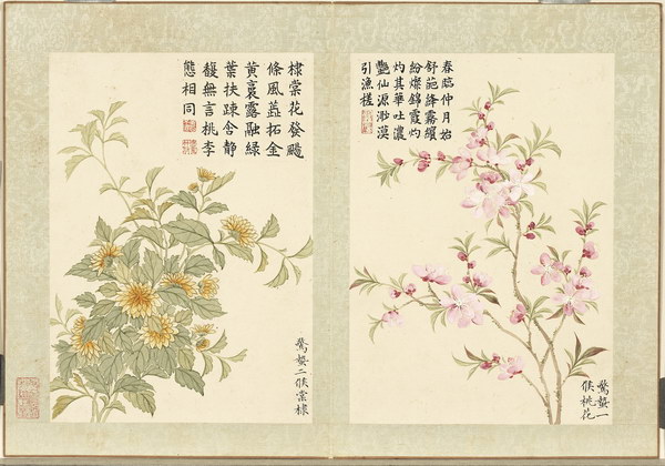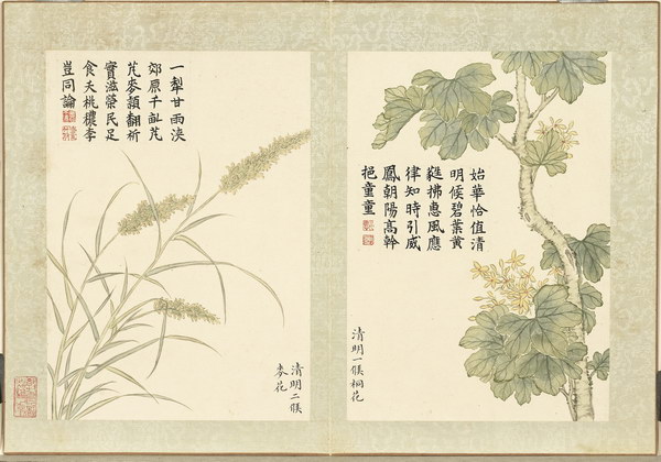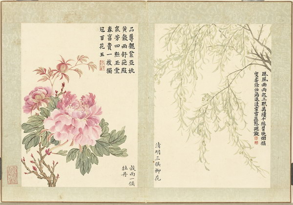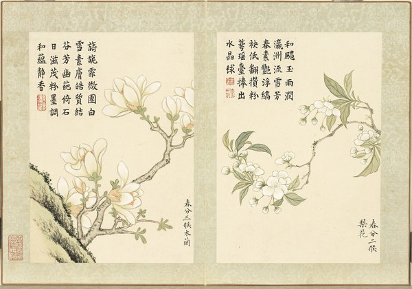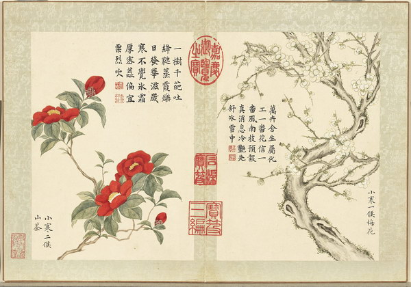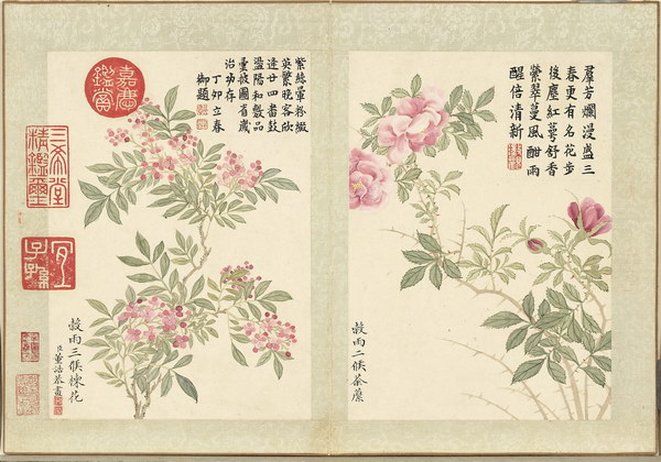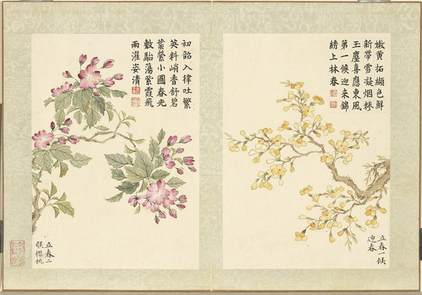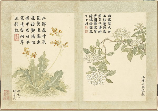 全册共十二开,二十四幅,描绘从小寒至谷雨共八个节气(约一百二十日,每气十五天,一气又分三候,五天一候)二十四侯对应花期的植物(始于梅花,终于楝花)。每幅均有清嘉庆帝题诗。
