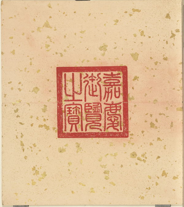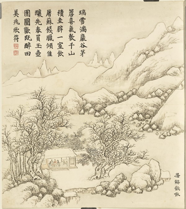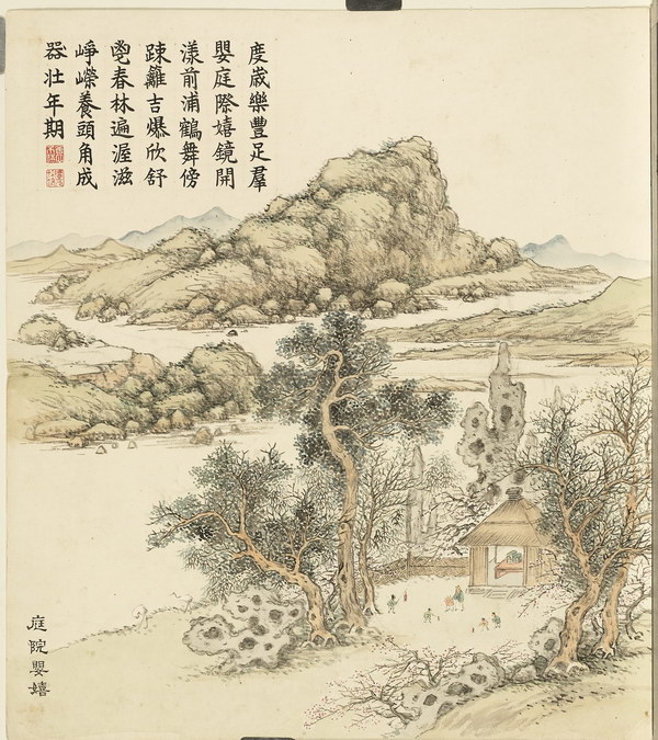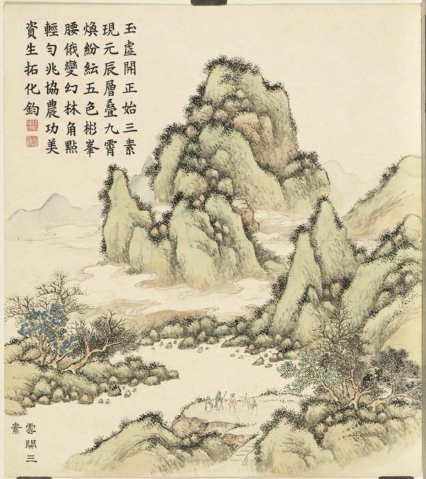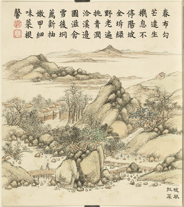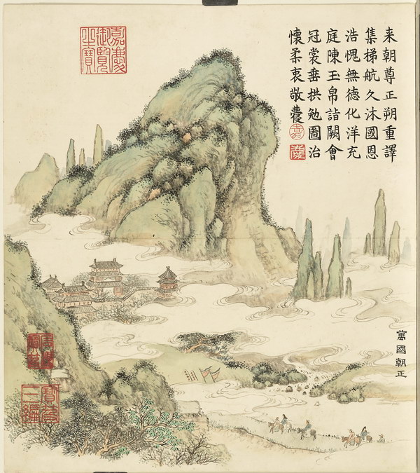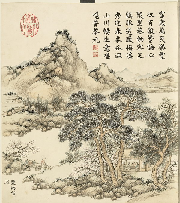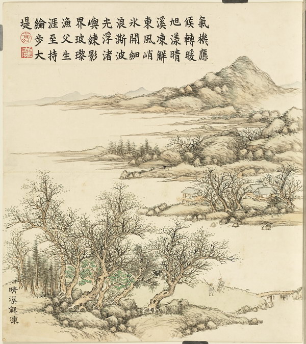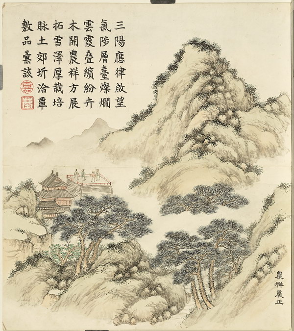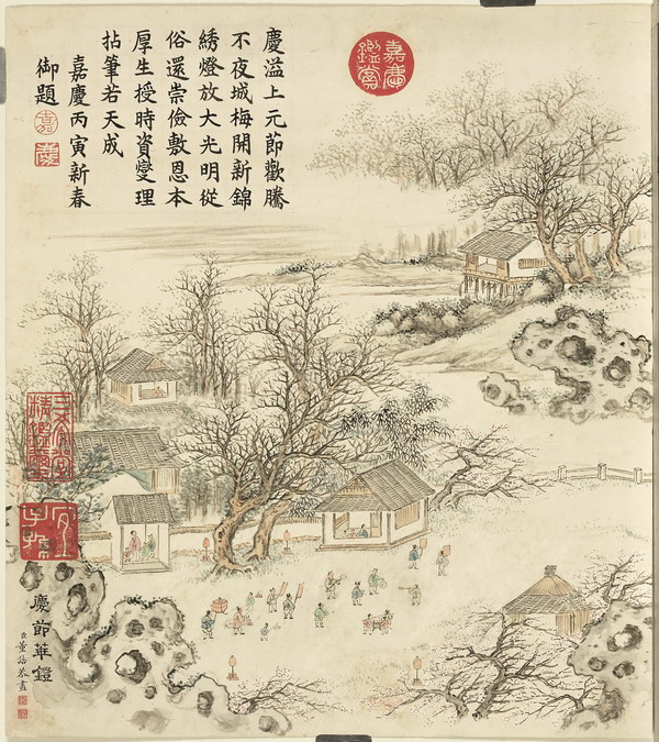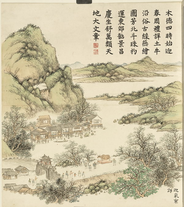 全册共十二(图十幅)开,应为嘉庆十一年岁末新春的应景之作,依次描绘了:万国朝正、丰乡贺岁、农祥晨正、迎气东郊、云开三素、庭院婴嬉、屠苏欢饮、晴溪解冻、暖风挑菜、庆节华灯。每幅均有清嘉庆帝题诗。款识:臣董誥恭畫。钤印:三希堂精鑑璽、宜子孫、石渠寶笈、嘉慶鑑賞、茂對時育萬物、嘉慶御覽之寶、寶笈三編、宣統御覽之寶