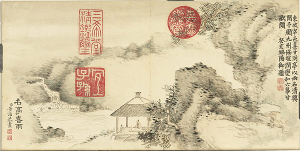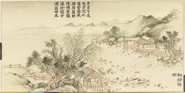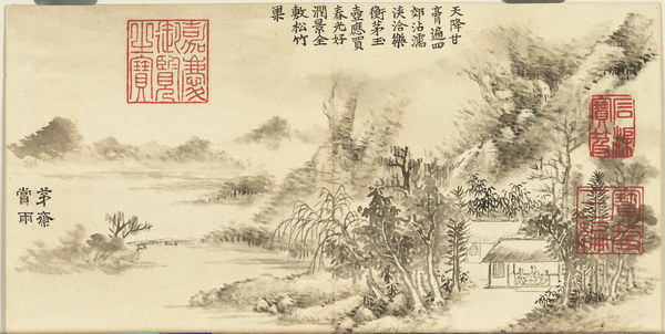 以 “雨” 为题名,依次为:茅斋赏雨、小楼听雨、竹泉春雨、春帆细雨、野舍时雨、岱云霖雨、新荷骤雨、甫田甘雨、潇湘夜雨、名亭喜雨。每幅均有清嘉庆帝题诗。跋文:清仁宗嘉庆跋:癸亥端陽御題,作者款識:臣董誥恭畫。钤印:嘉慶御覽之寶、嘉慶鑑賞、石渠寶笈、三希堂精鑑璽、宜子孫、寶笈三編、嘉慶御覽之寶、惟幾惟康、宣統御覽之寶