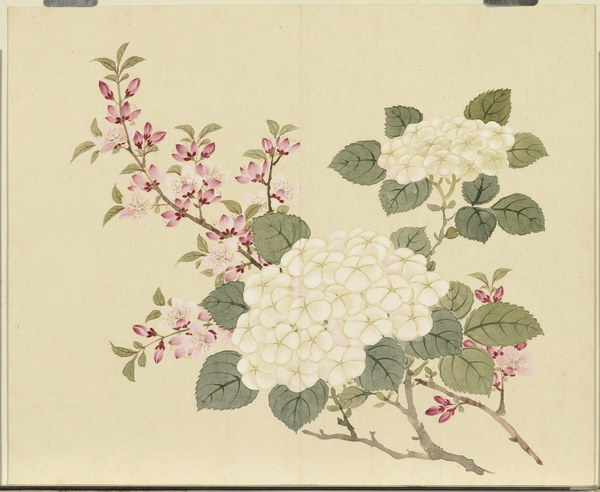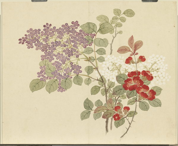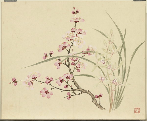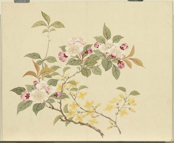春景:梅花和兰花、杏花和梨花、碧桃花和油菜花、海棠花和不知名黃花、李花、桃花和繡球、紫丁香和茶花、紫藤和月季、木蘭和魚兒牡丹、春景花卉之十