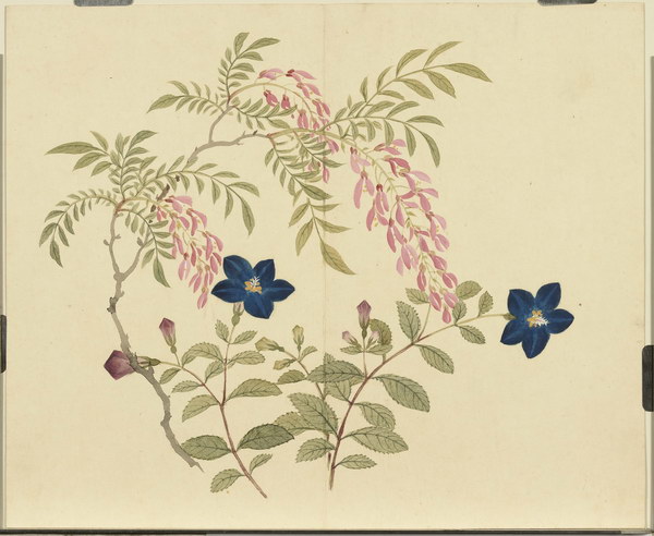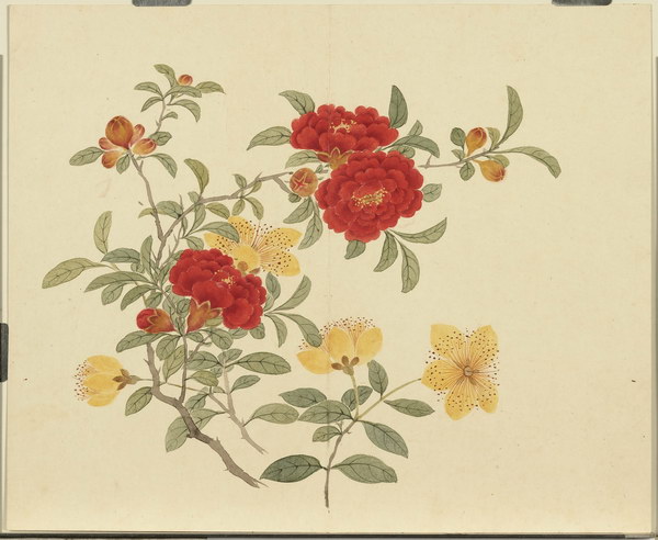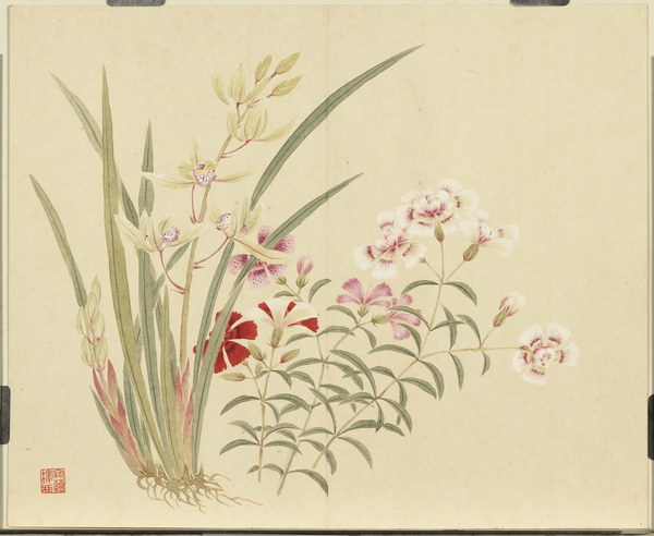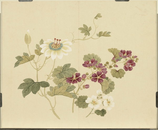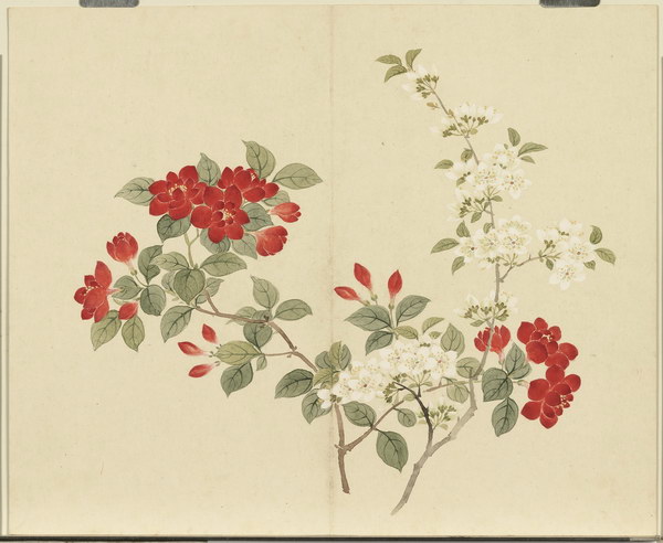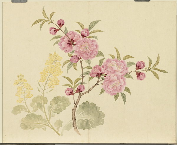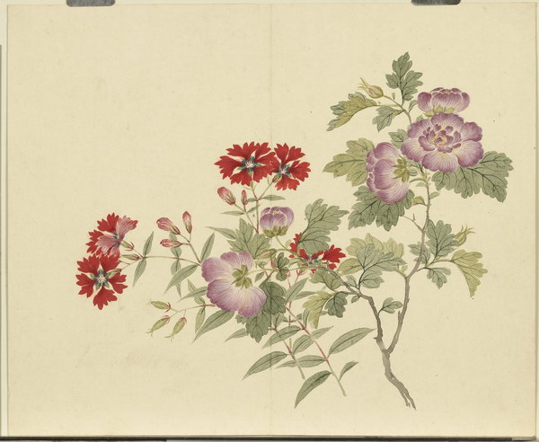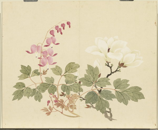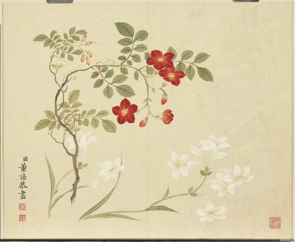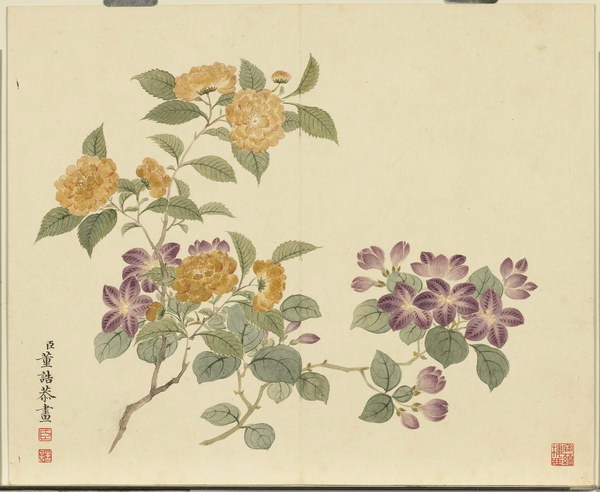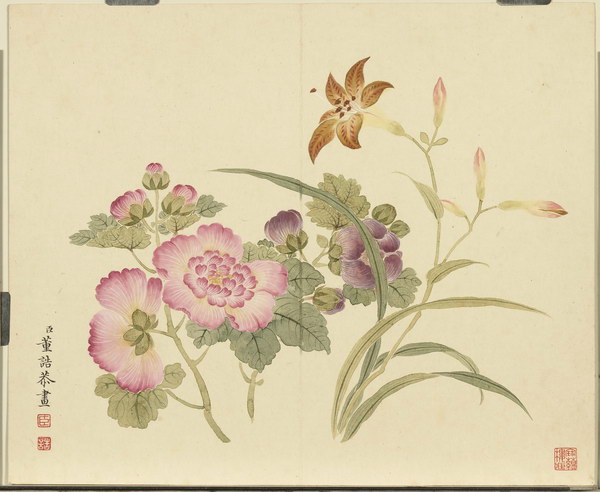 《四景花卉图册》由清代董诰绘制。全套共四册(每册十开),每开两种花卉,绘制四季(春夏秋冬)花草。作者款识:臣董誥恭畫。
