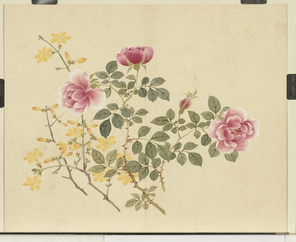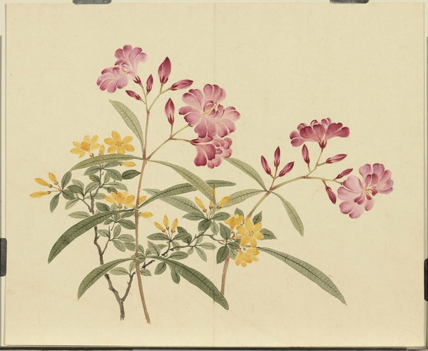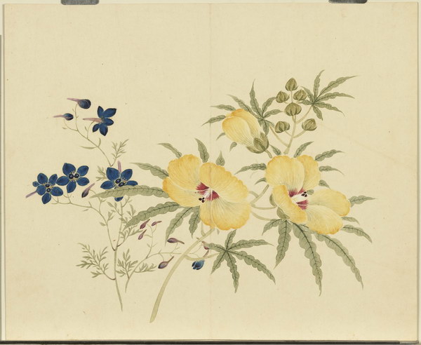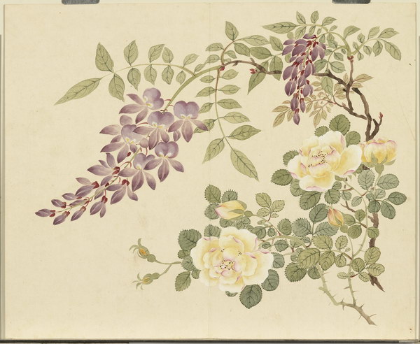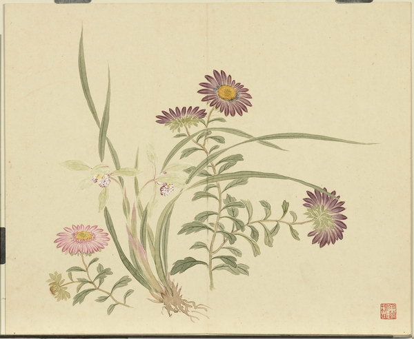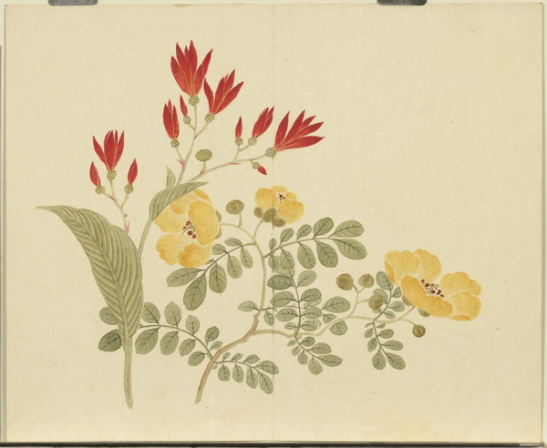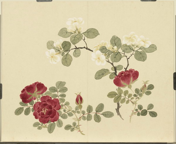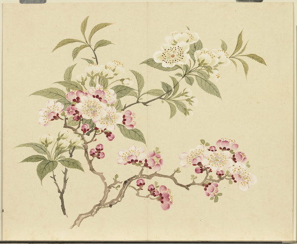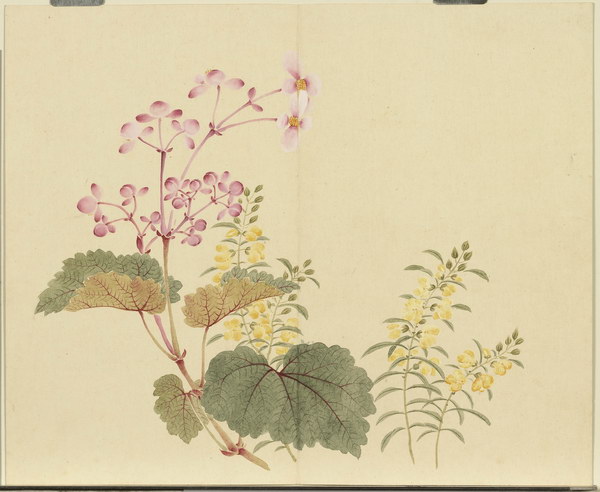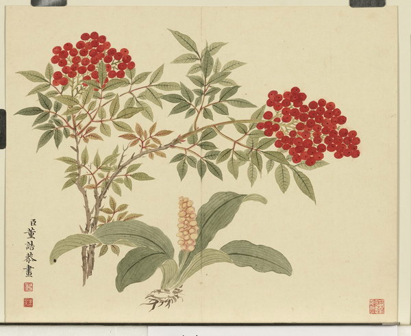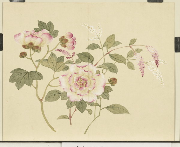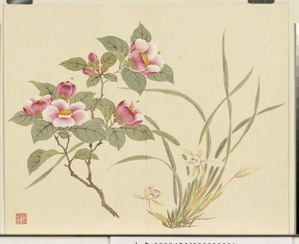 《四景花卉图册》由清代董诰绘制。全套共四册(每册十开),每开两种花卉,绘制四季(春夏秋冬)花草。作者款识:臣董誥恭畫。
