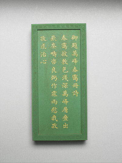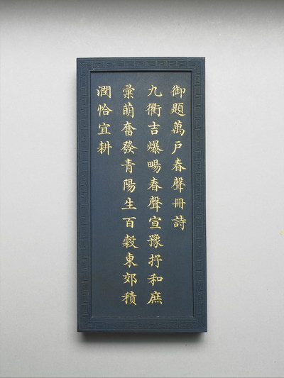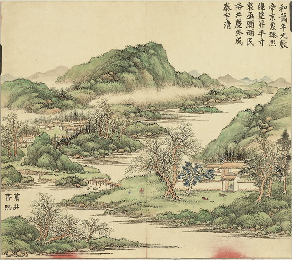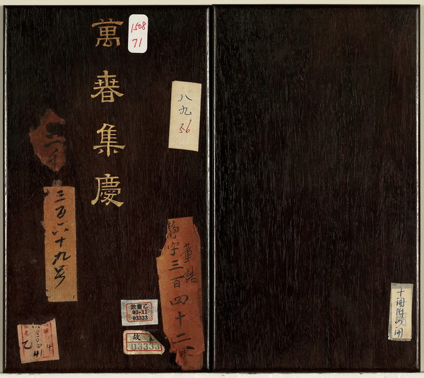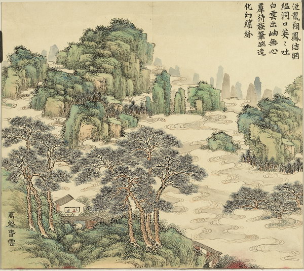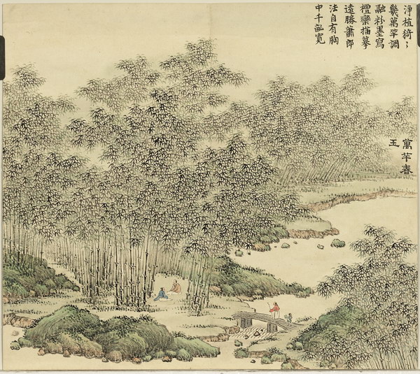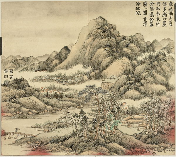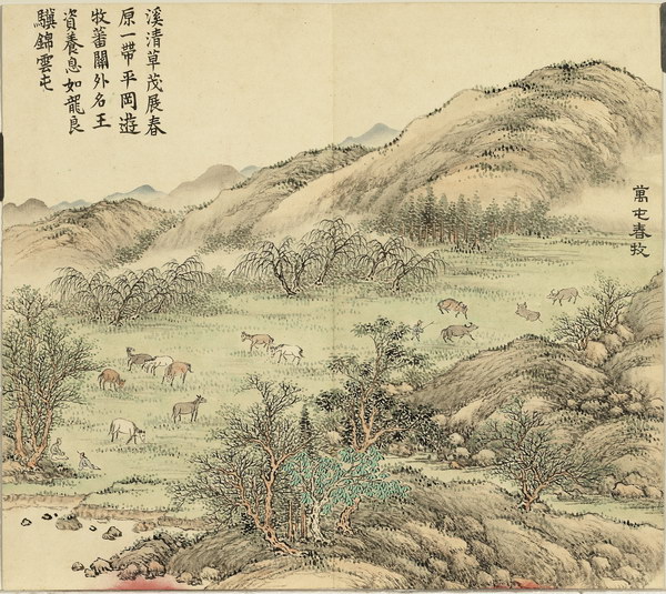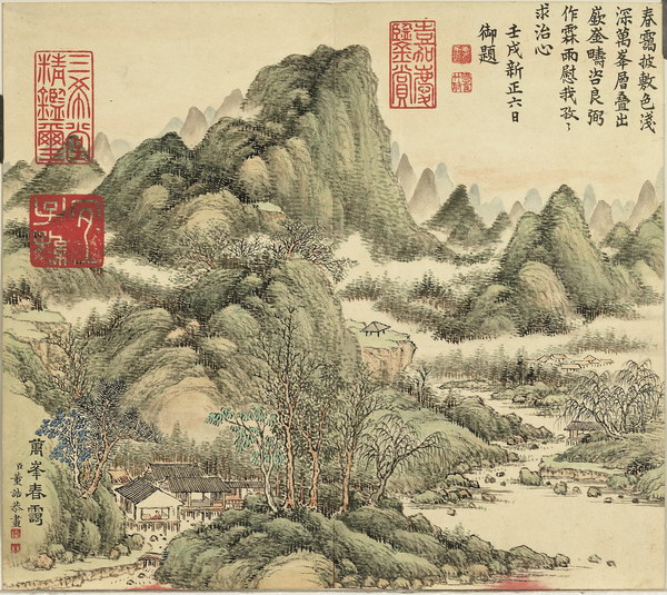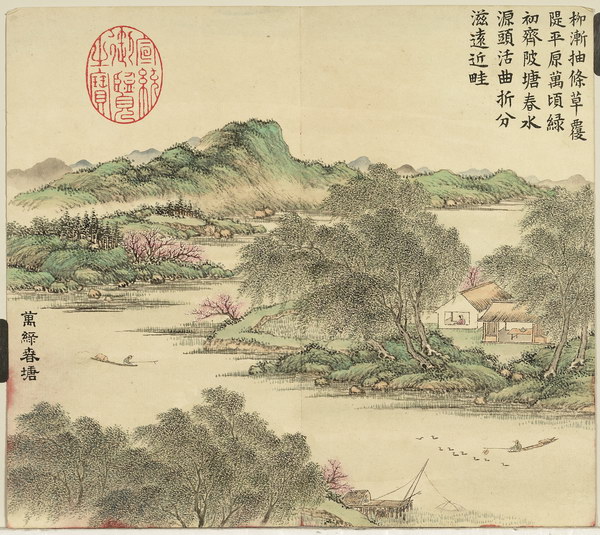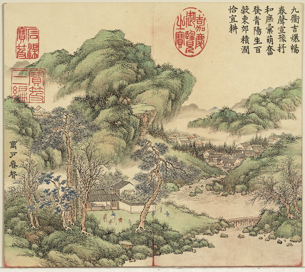 全册共十开,以 “万”、“春” 为题名,依次为:万户春声、万绿春塘、万家春雨、万亩春耕、万壑春云、万派春涛、万竿春玉、万屯春牧、万井春熙、万峰春霭。每幅均有清嘉庆帝题诗。并附画册同名五色画锭。